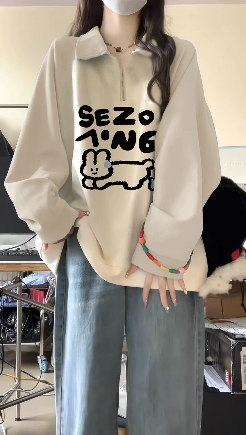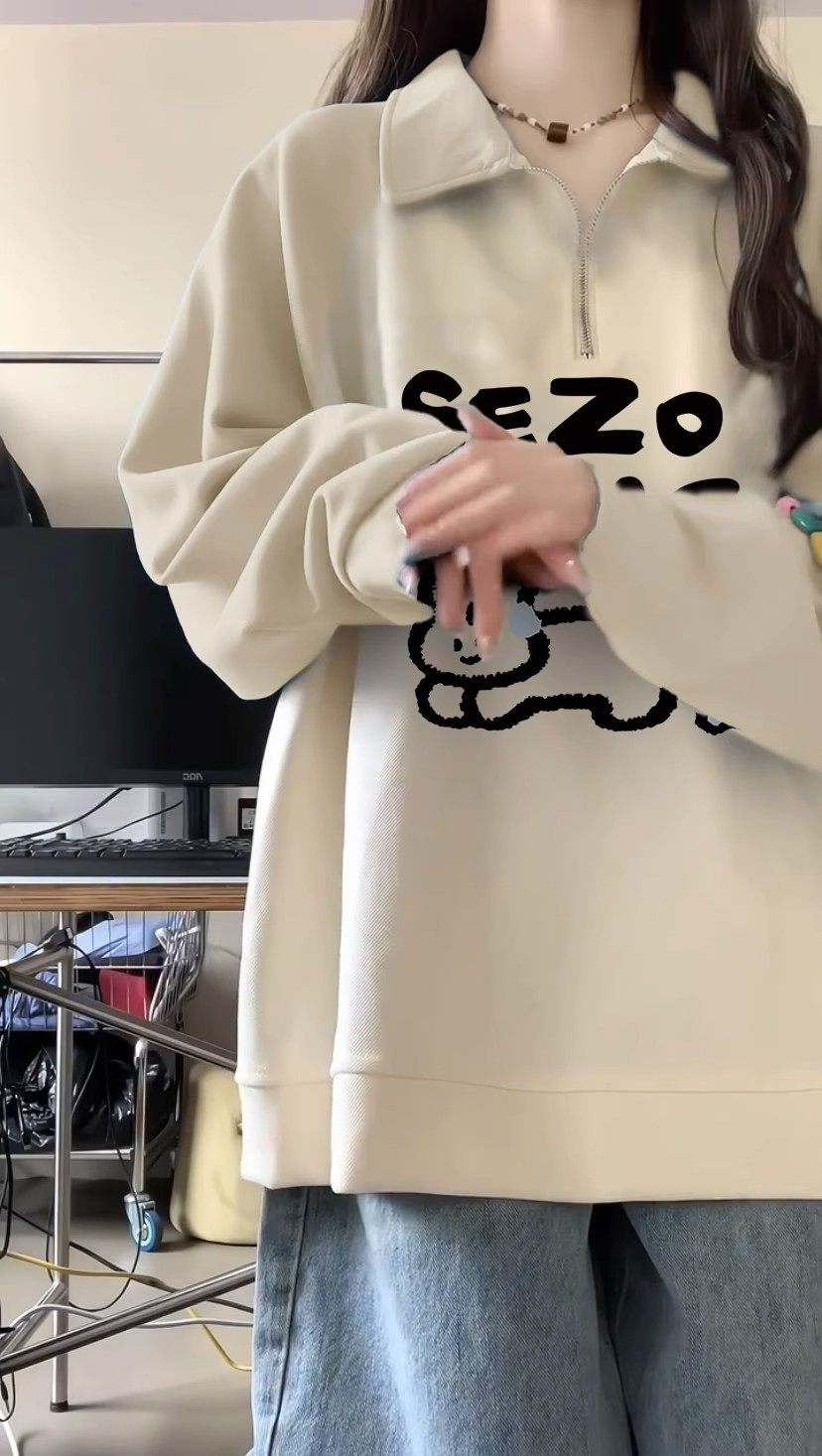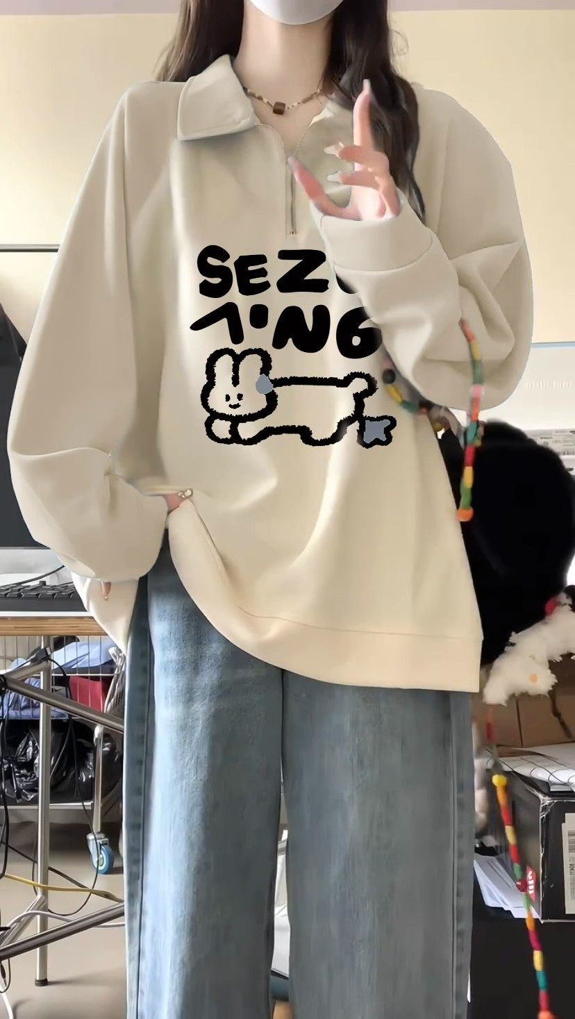 Apricot polo collar half zipped sweatshirt woman 2023 new autumn and winter plus suede thickened oversize jacket blouses-Taobao