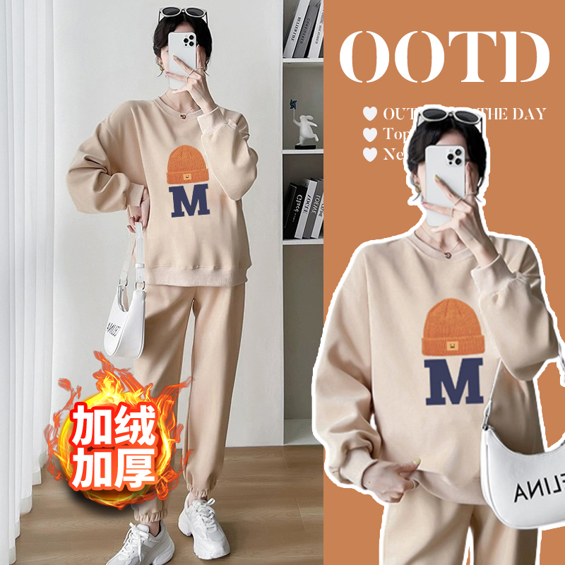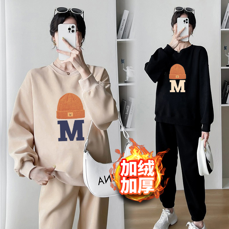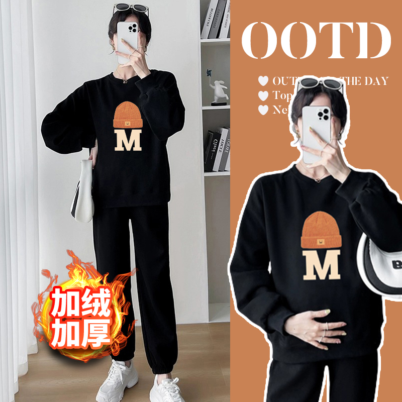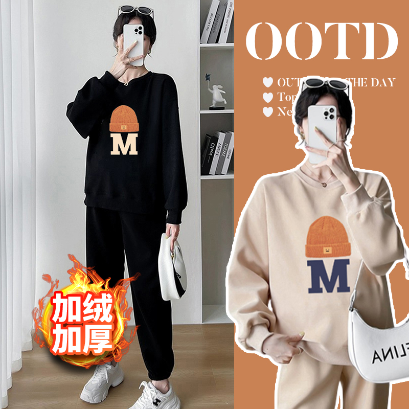 Pregnant Woman Suit Plus Suede Thickening Warm Cartoon Casual Sports Round Collar Sweatshirt Two Sets 2023 New Spring Autumn Winter-Taobao