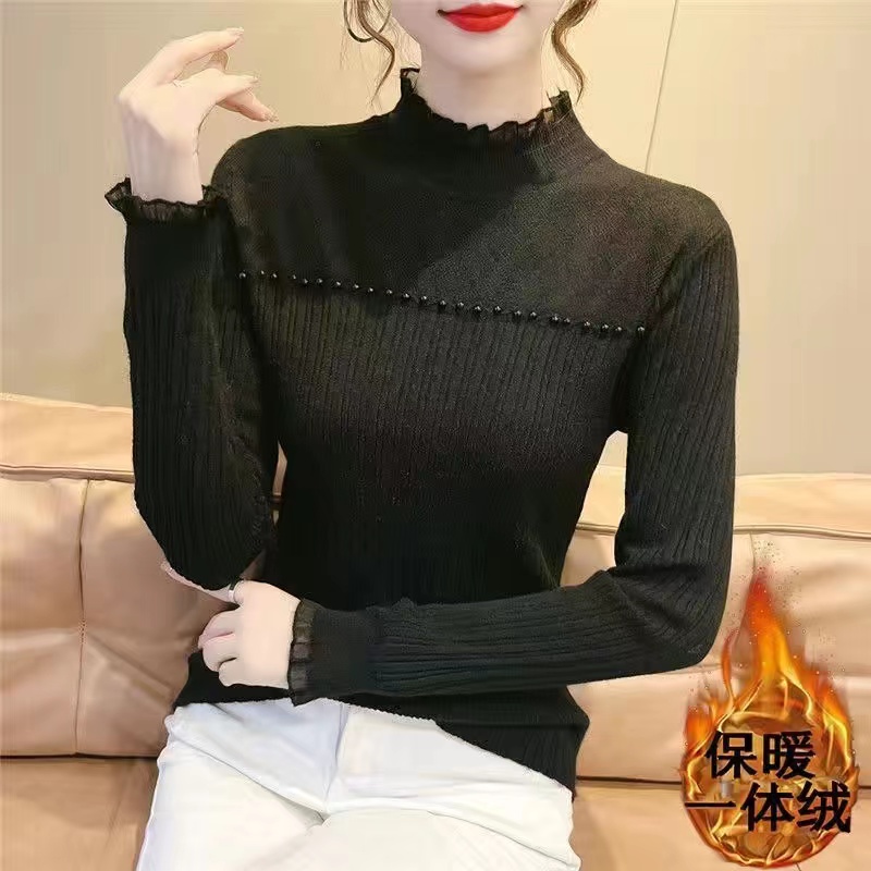 2023 Spring and autumn new sweet and versatile beating undershirt woman half high collar sweater with lace inside a knitted sweatshirt blouse-Taobao