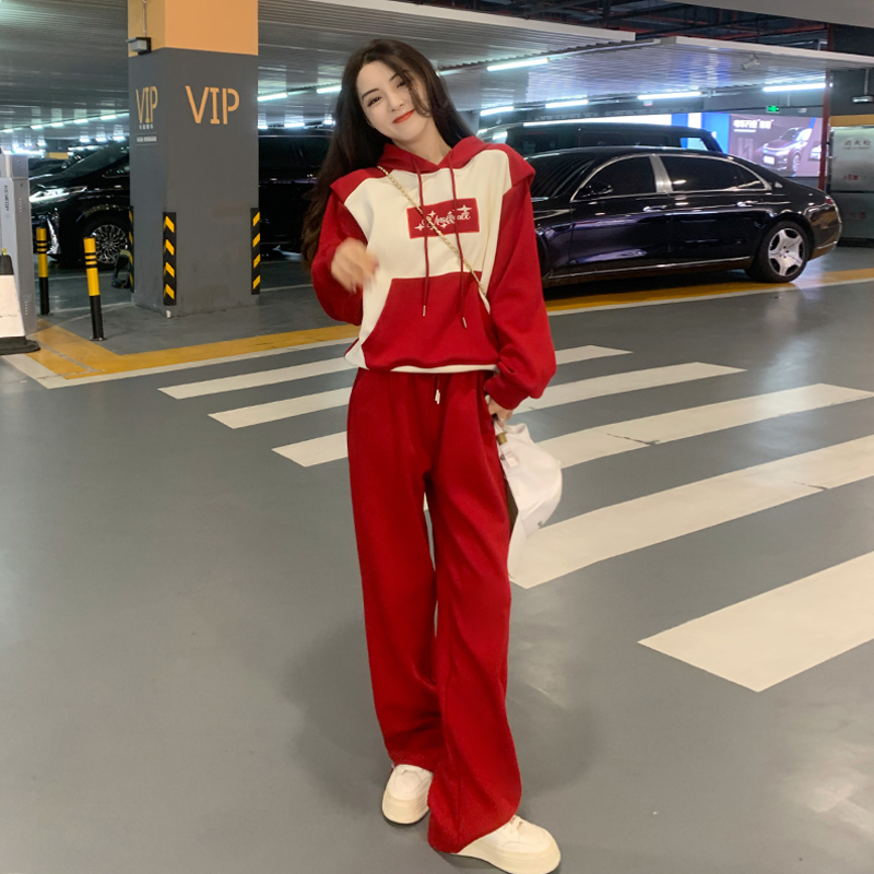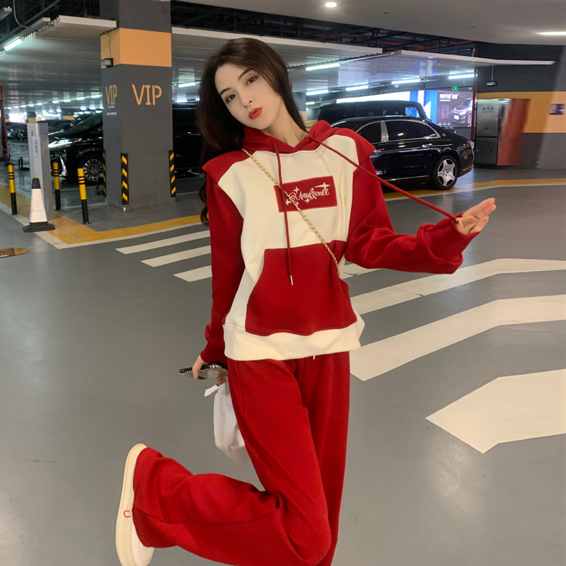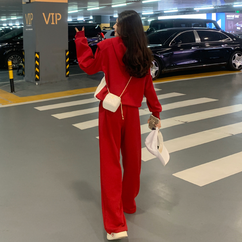 Net Reddish Red Sports Casual Suit Woman Autumn Winter Foreign Air Blast Street Superior Sensuo Clothing Broadlegged Pants Two Sets-Taobao