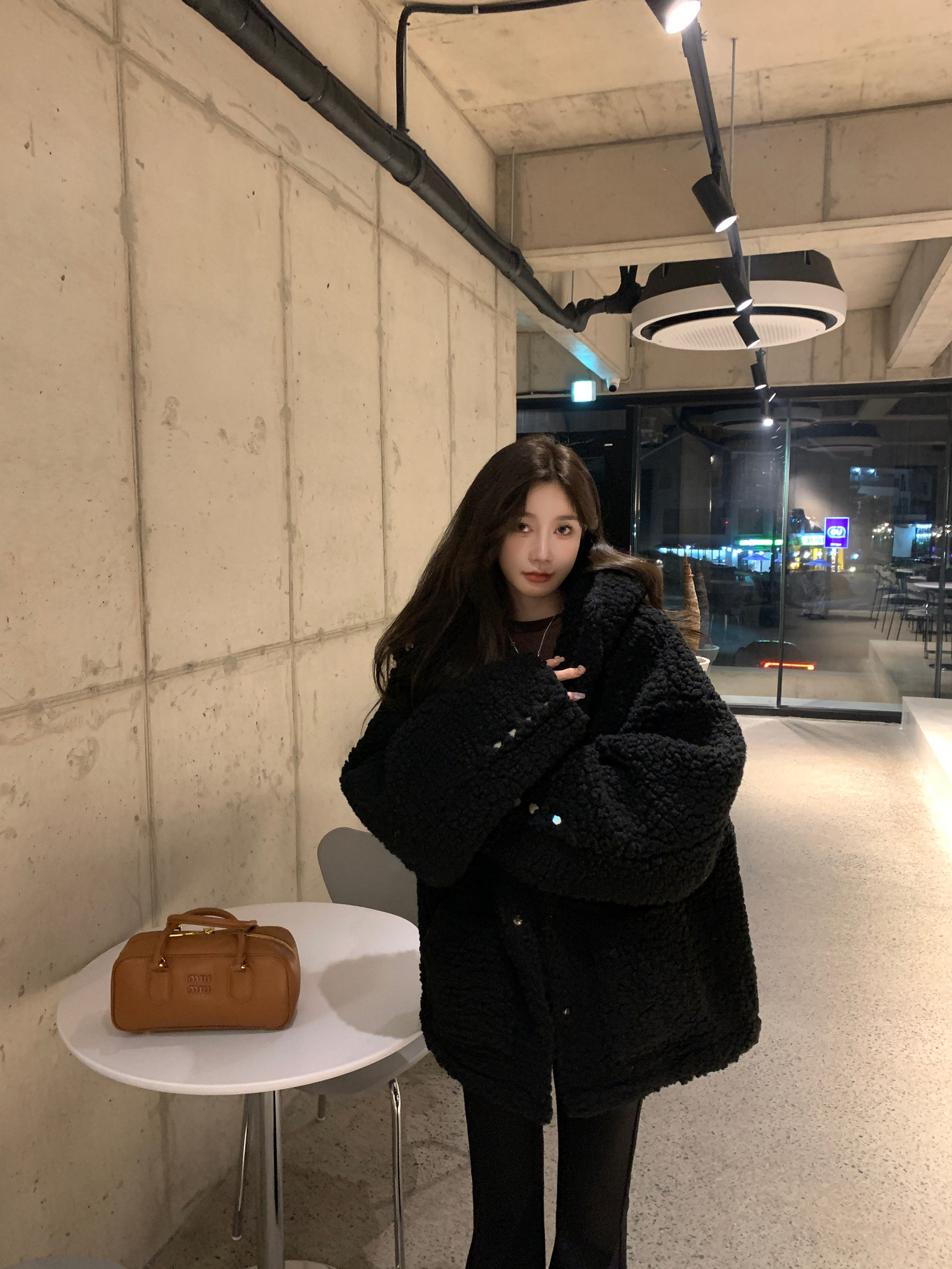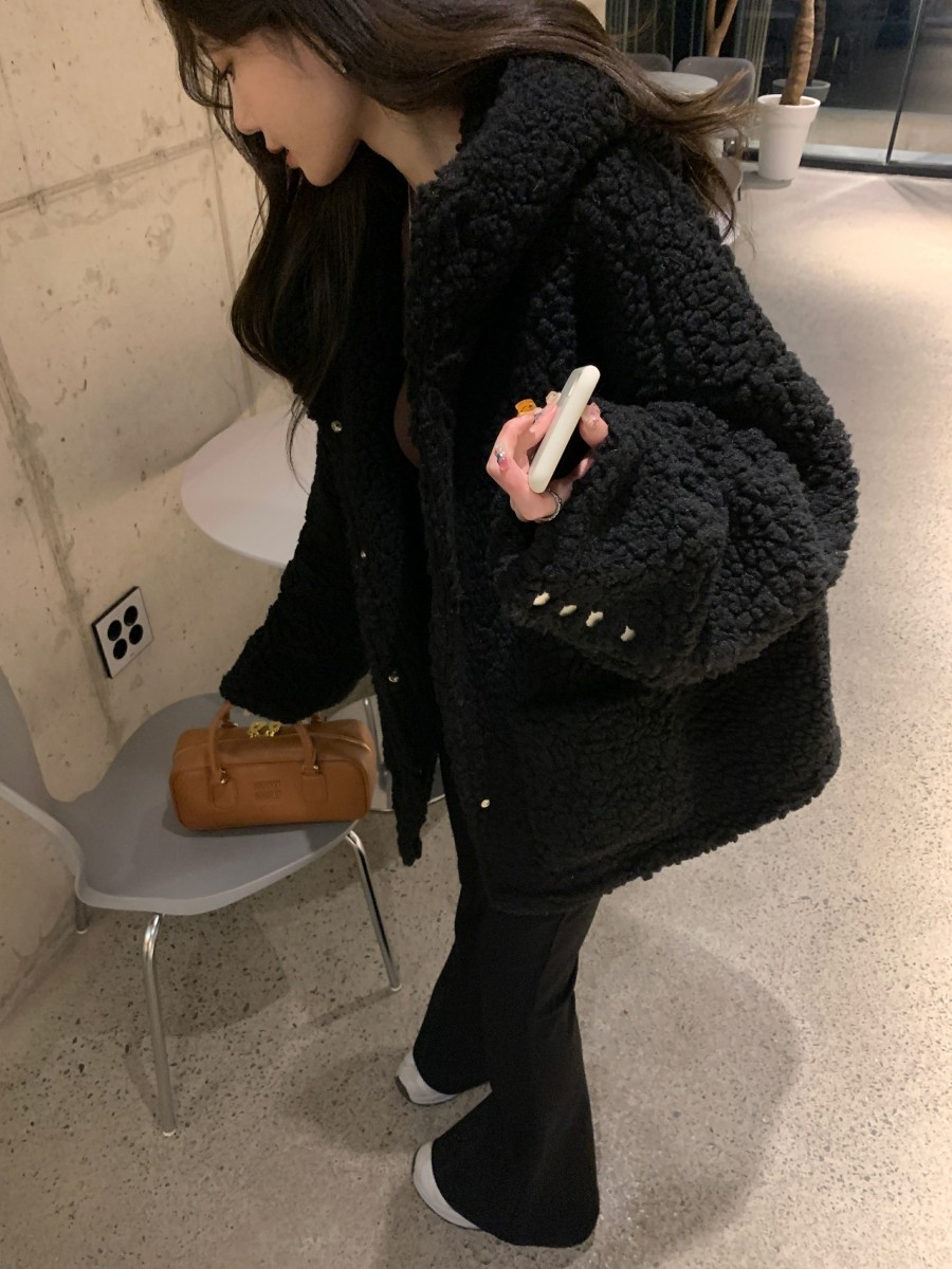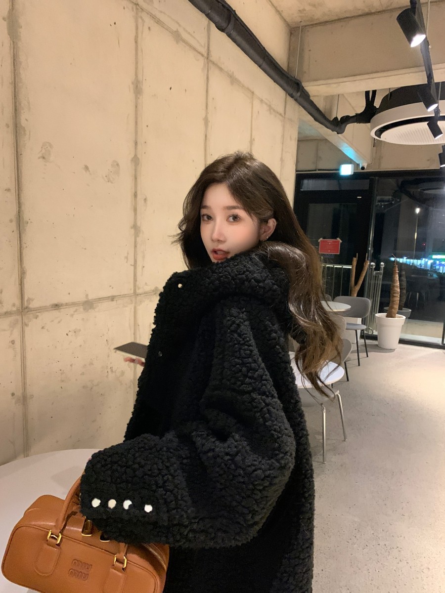 alex stevens grain suede lamb wool coat female winter black tandem cap loose thickened fur coat-Taobao