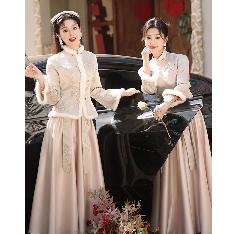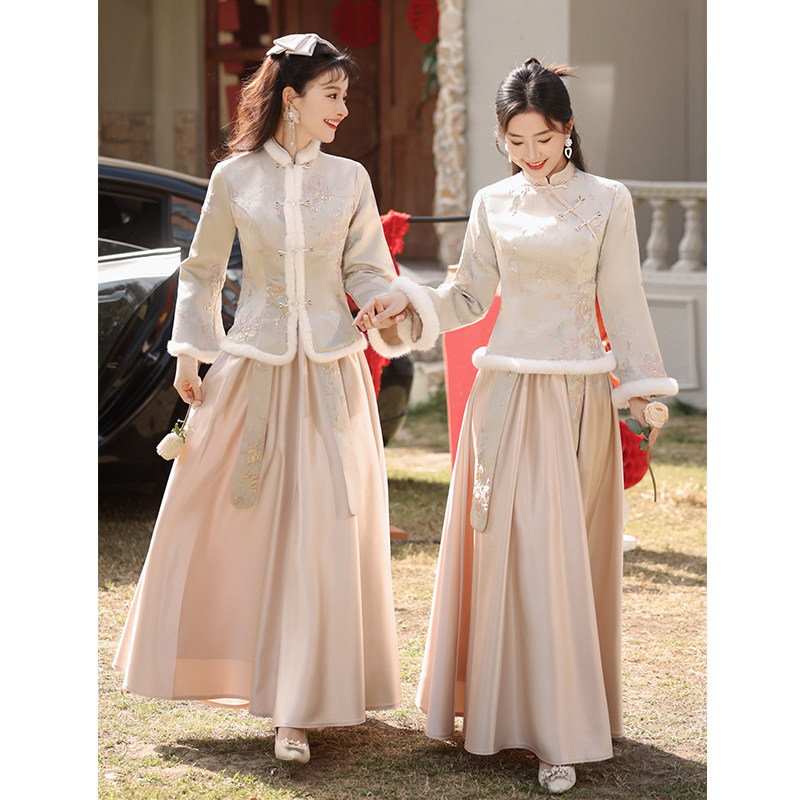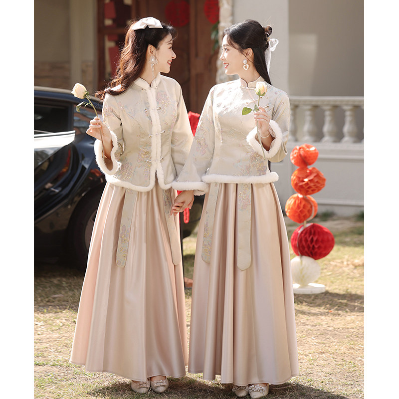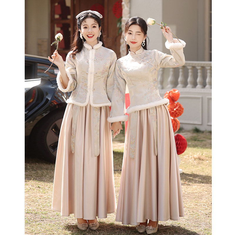 Chinese bridesmaids clothes autumn and winter style 2023 new winter thickened warm Chinese wind and sisterhood dress skirt woman long sleeve-Taobao