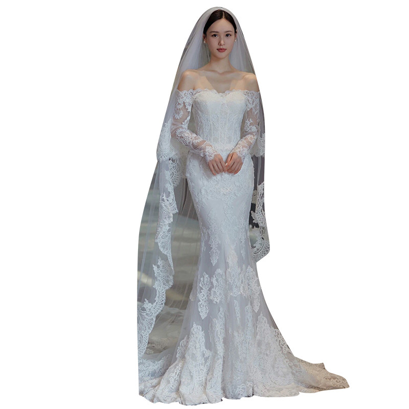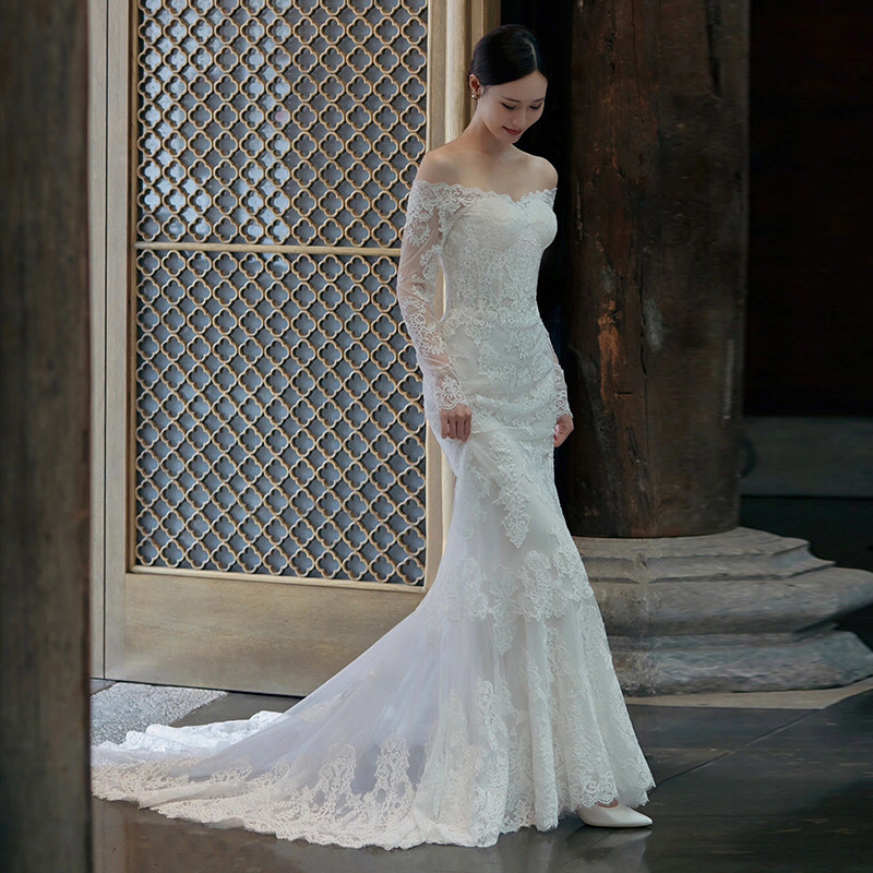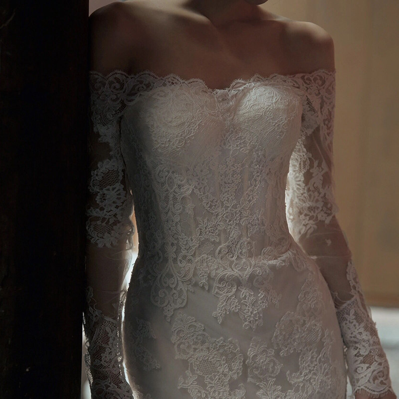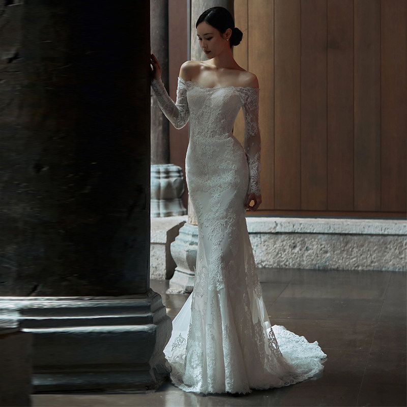 Straight Shoulder Method Long Sleeve Light Wedding Dress Winter Advanced Sensation Lace Sensuary Retro Out of the Fairy Tail Gown-Taobao