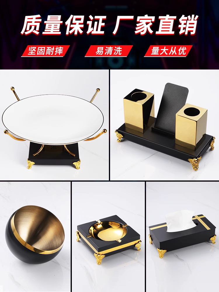 Black Gold Ashtrays Black Gold Straight Microphone Rack Black Gold Slanted Microphone Rack Black Gold Desktop Trash Can Black Gold High Foot Fruit Tray Rack (With Fruit Disc) Black Gold Tissue Box Black Gold 6 Holes Beer Rack Black Gold 12 Holes Bullets Cup Rack Black