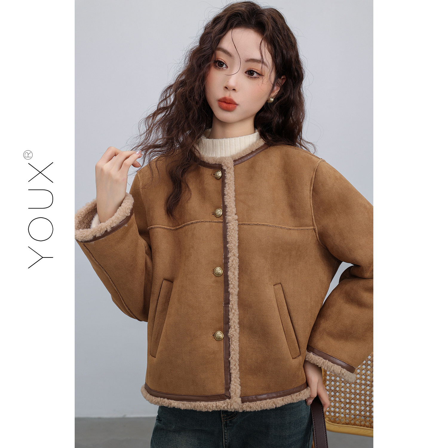 YOUX (sugar fried in chestnut) Maillard coat woman 2023 Winter new vintage plus suede thickened round collar blouses-Taobao