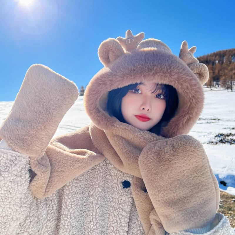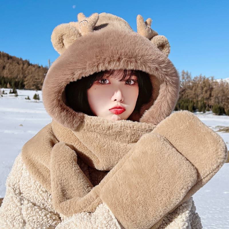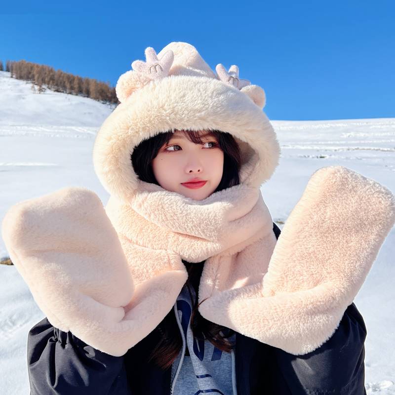 Small Bear Hat Autumn Winter Women Scarf Gloves All-in-one Cap Winter Scarf Cute Warm Plush Winter Three Sets-Taobao