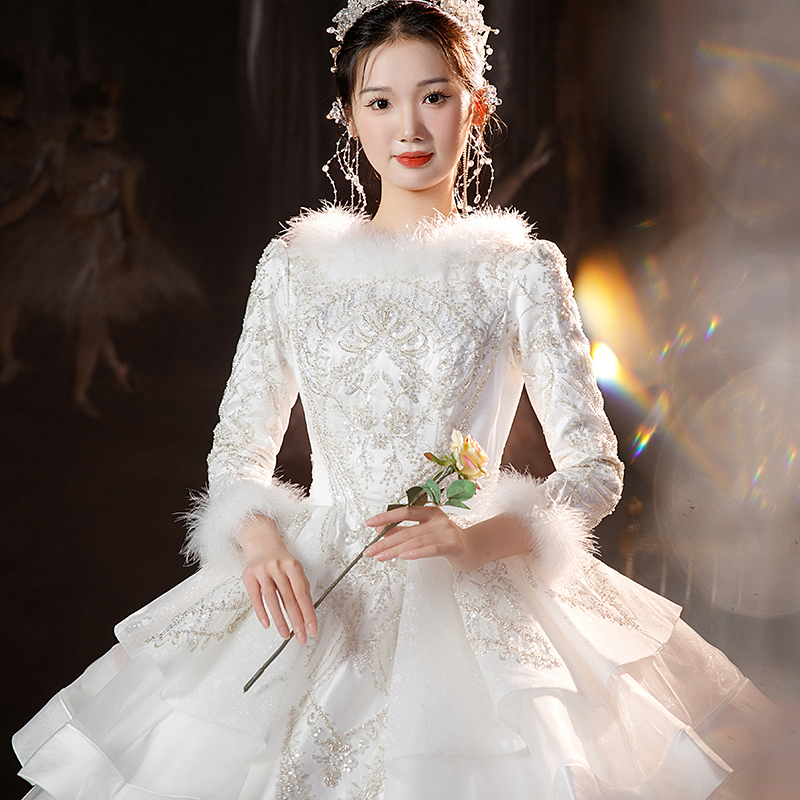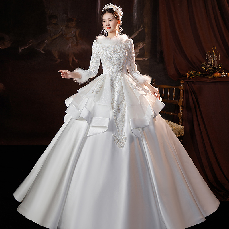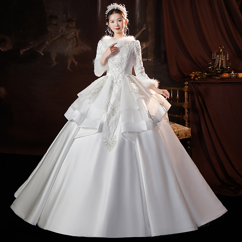 Fan-style light main wedding dress 2023 new brides small sub-ground winter long sleeves satin bread to thicken warm-Taobao