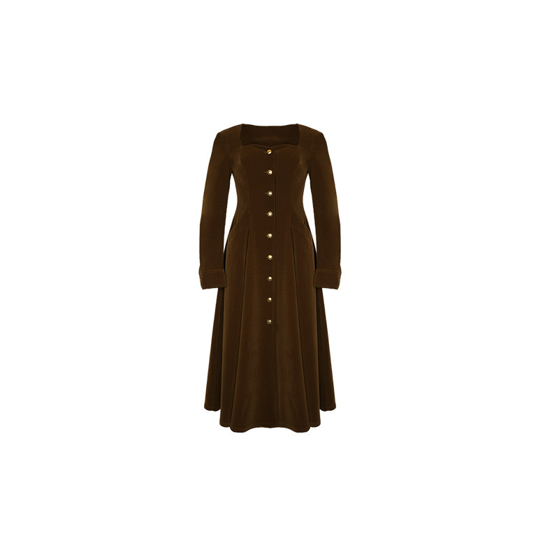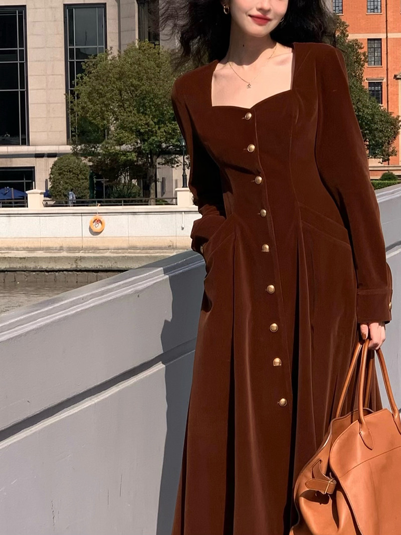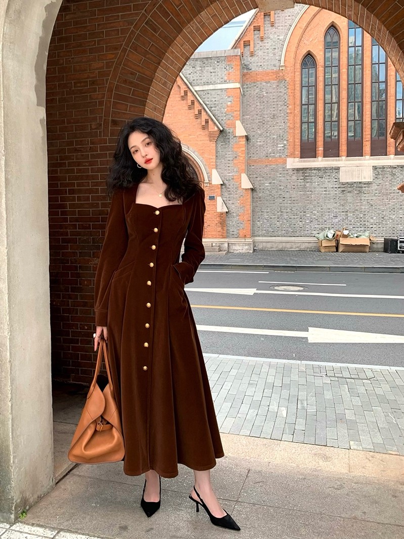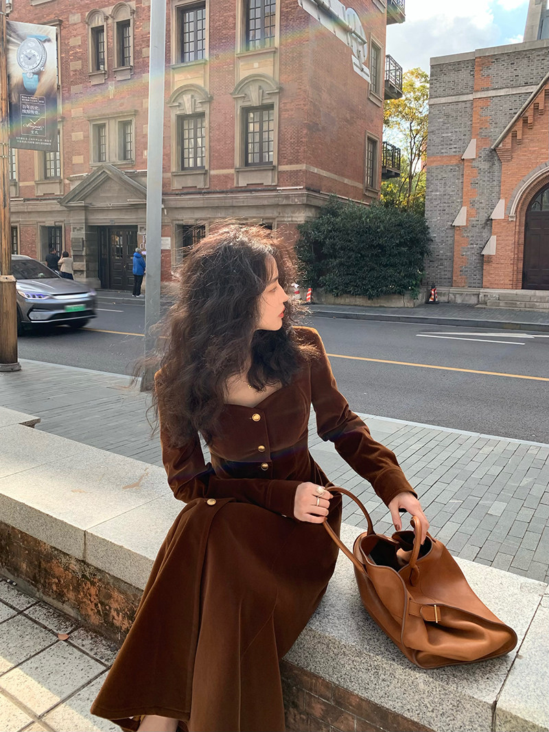 Wine Afternoon Homemade Style Vintage 2023 Autumn Winter New square collar matte silk suede one-piece dress with high waist and large hem skirt children-Taobao