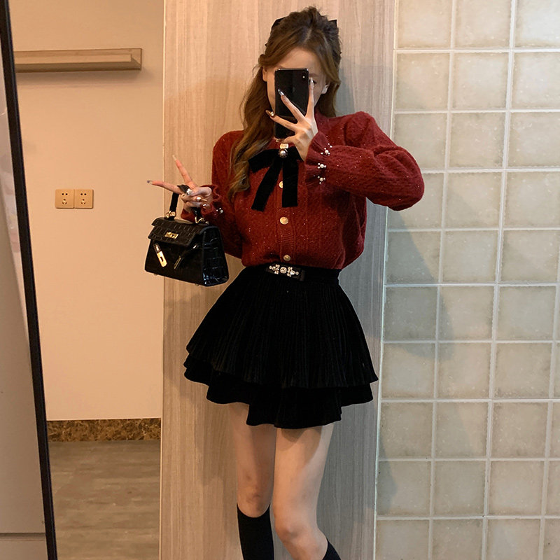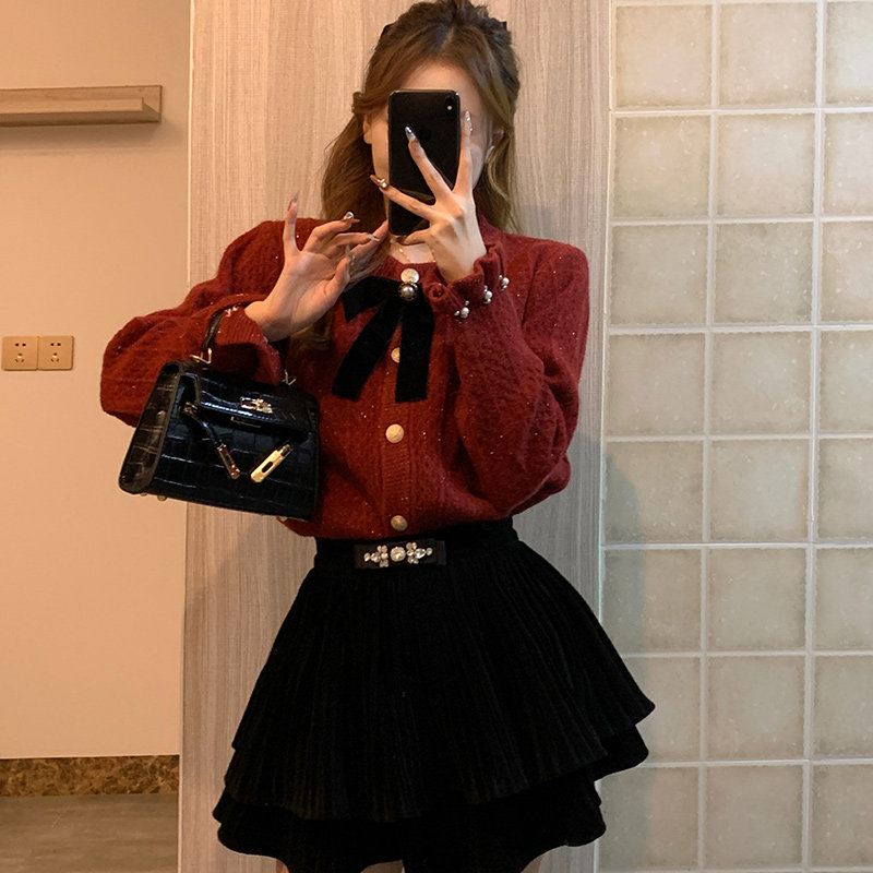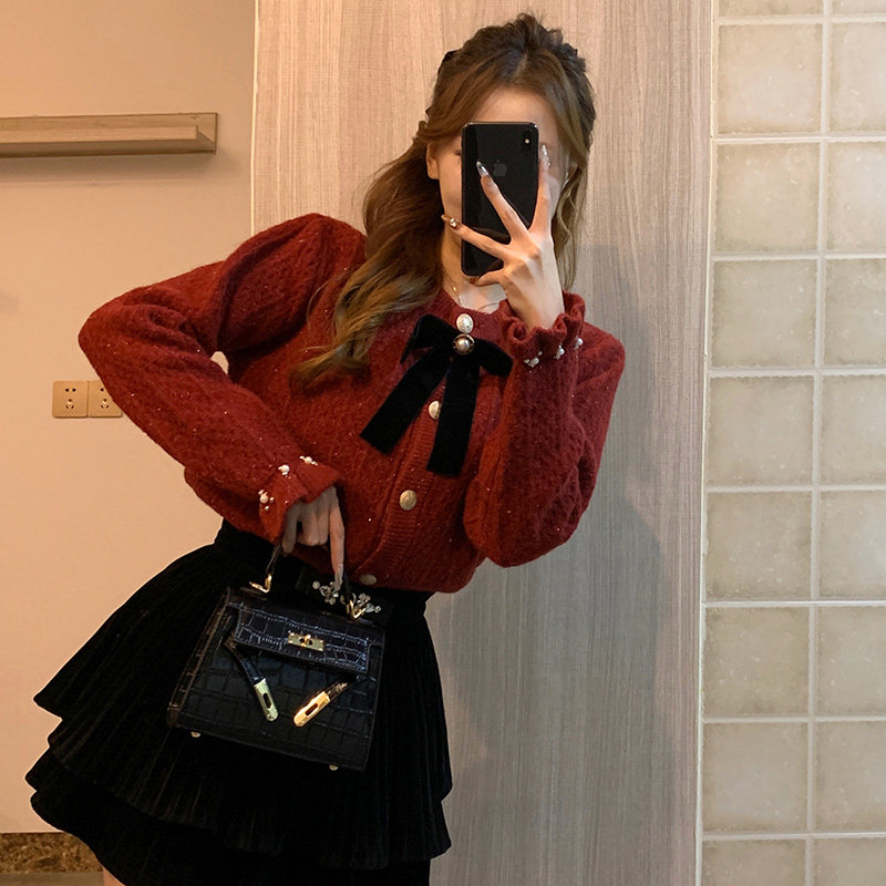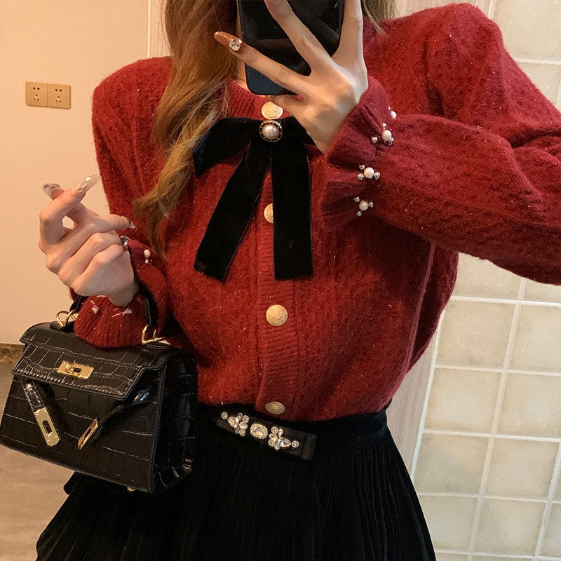 Autumn Winter New Year Red Sweater Women Bow Knit Cardiovert Hooded Coat Brightly Christmas small Fragrant Breeze blouses-Taobao
