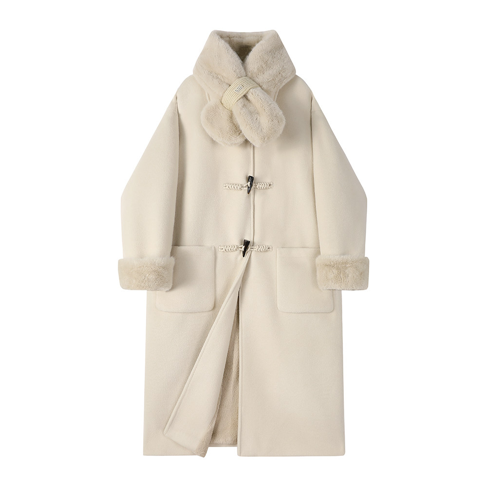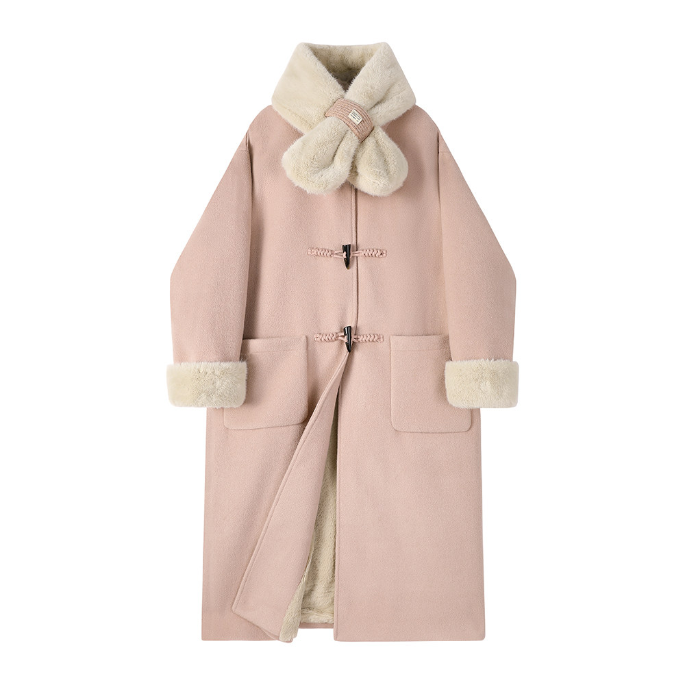 Korean in Korean ensemble Long-style horn buckle Double face cashmere pink wool big coat wool Thickened Coat Woman Autumn Winter Advanced Sensation-Taobao