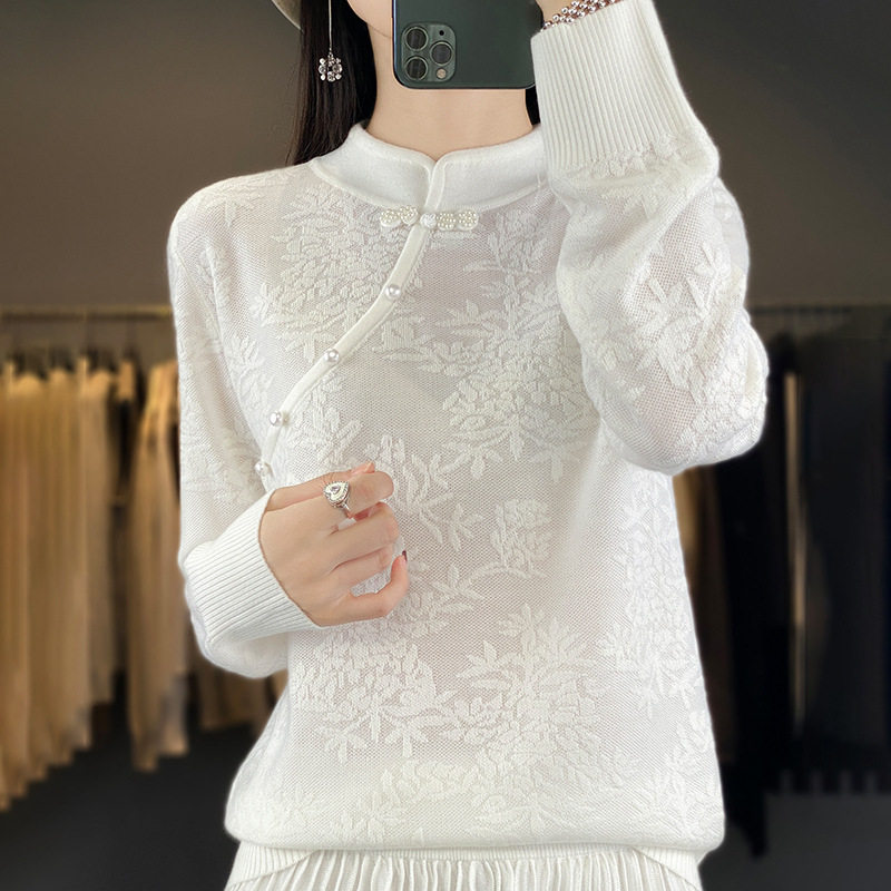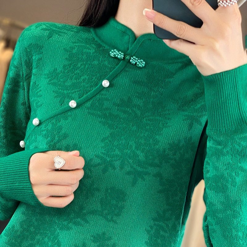 New Chinese qipao collar cashmere sweatshirt female solid relief hook flower blouses 100 hitch wool knit undertide sweatshirt-Taobao