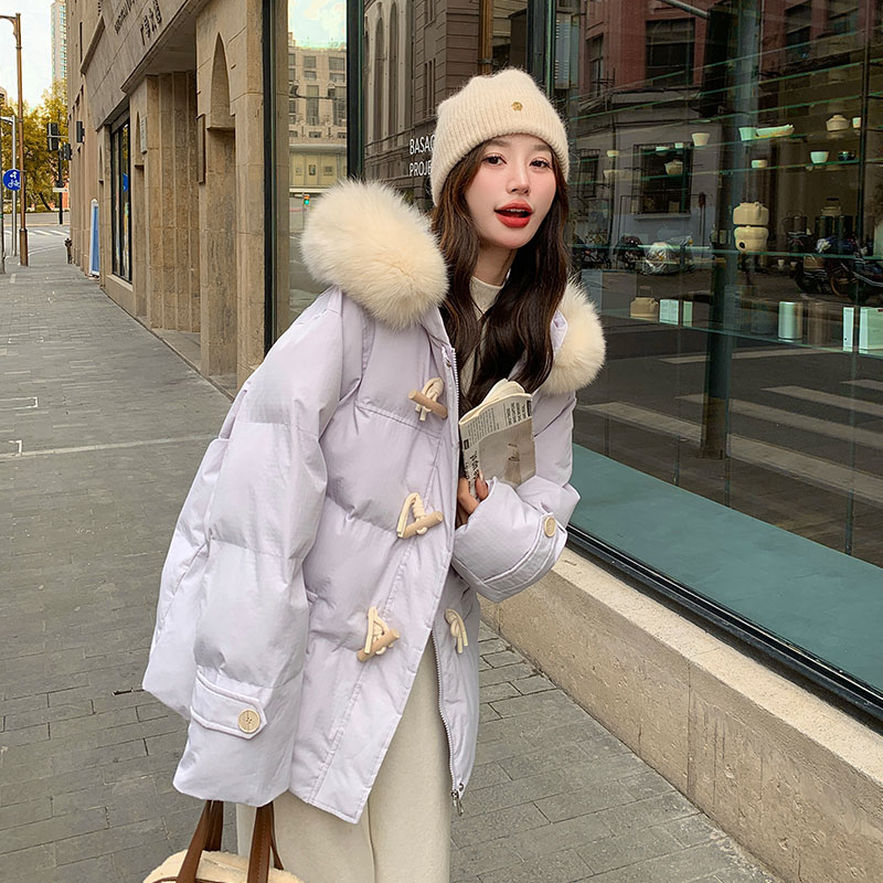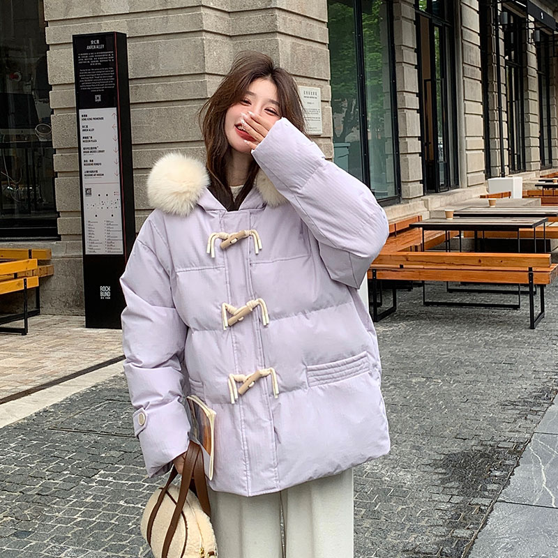 Purple horn buckle down cotton clothes Women in winter 2023 new Korean version loose with large fur collar thickened bread coat-Taobao
