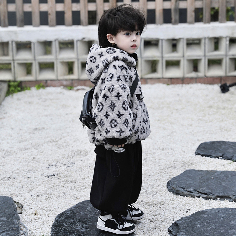 Boy handsome chic suit autumn winter baby gush thickened with cap jacket children casual sports pants two sets-Taobao