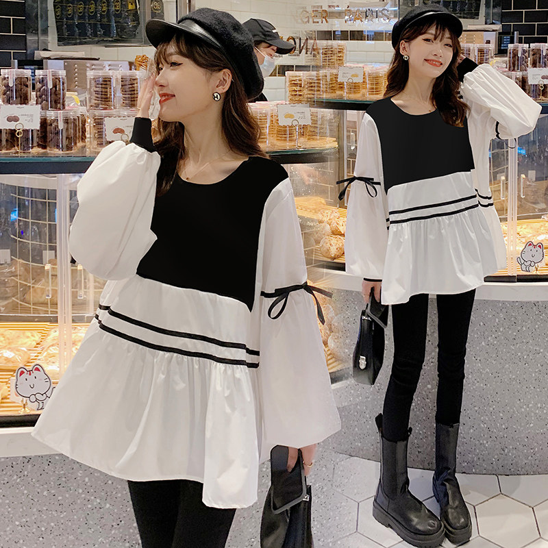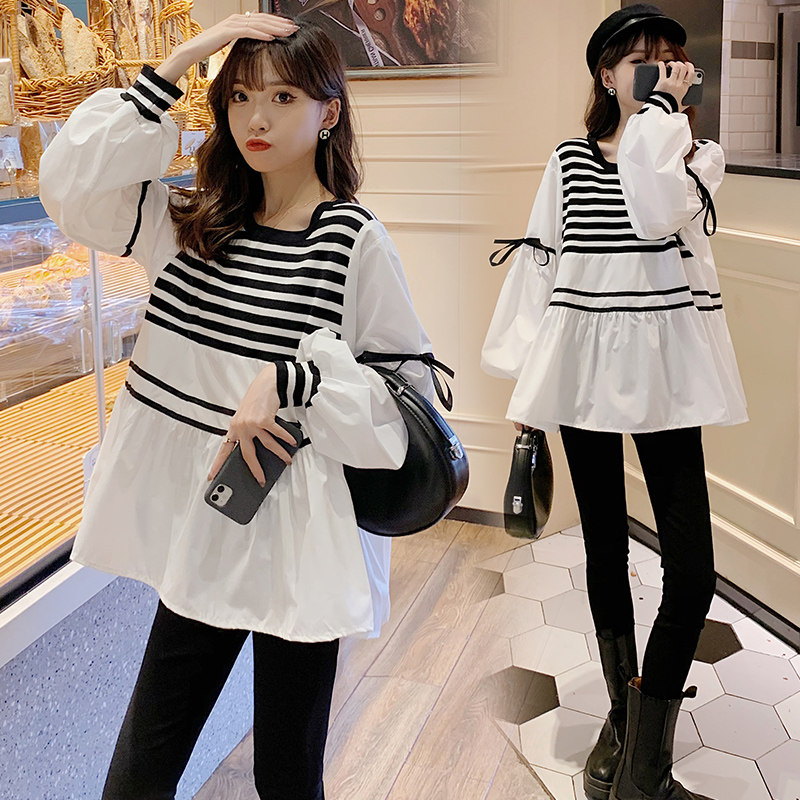 2023 autumn and winter new suit Korean version fashion display slim knit striped splicing shirt big code blouses gestation damp-Taobao