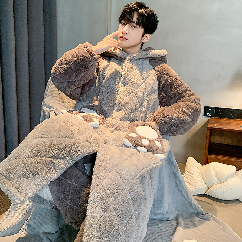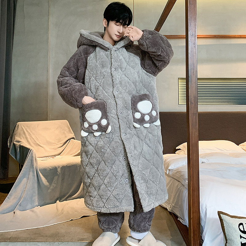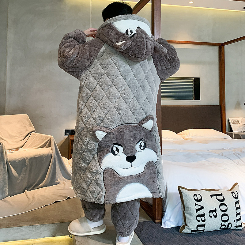 Men's Sleeping Robes Triple Clip Cotton Winter Day Sleeping Clothing Men's Coral Suede Thickened Garnter Teen Cute Home Conserved-Taobao