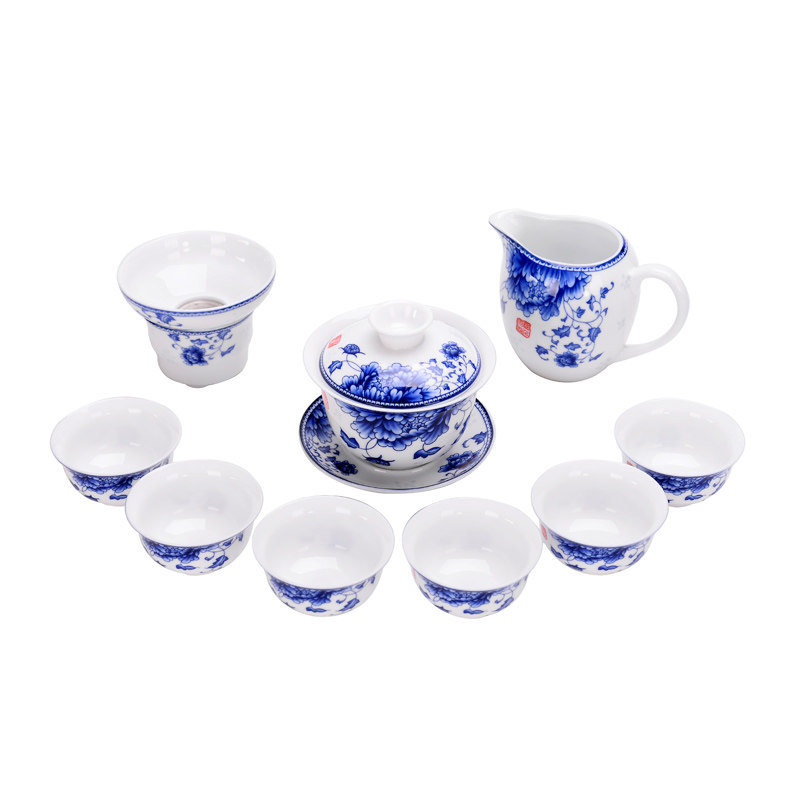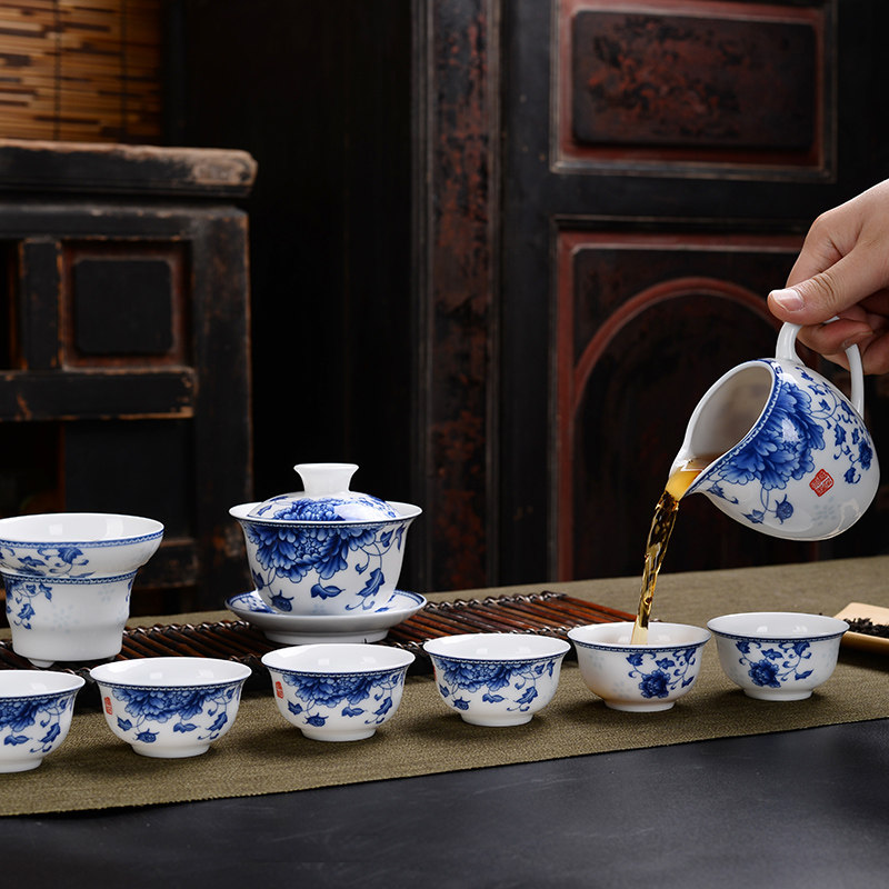 Green flower porcelain tea set suit home whole set of ceramic kung fu tea set white porcelain tea tea ware lid bowl tea cup office gift-Taobao