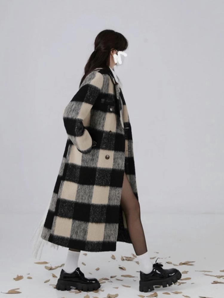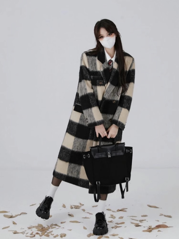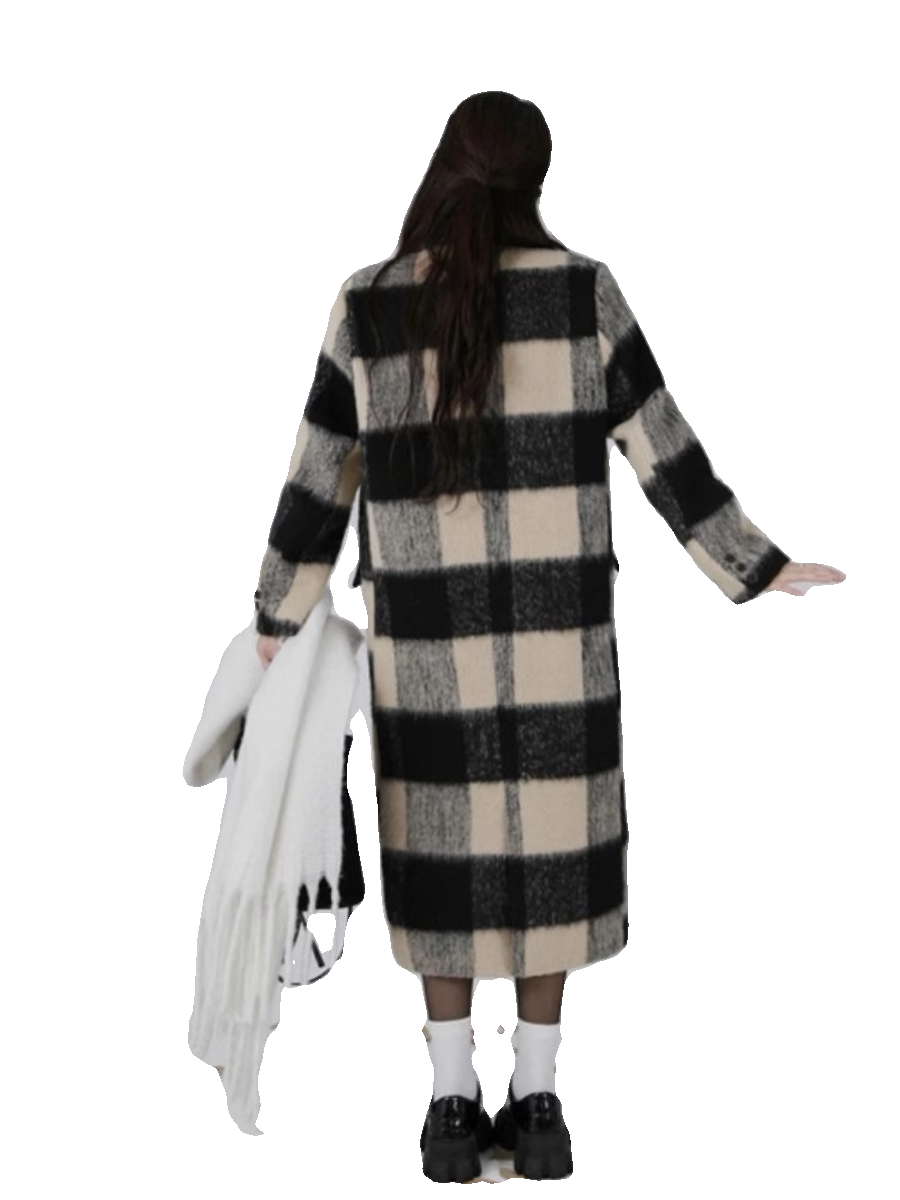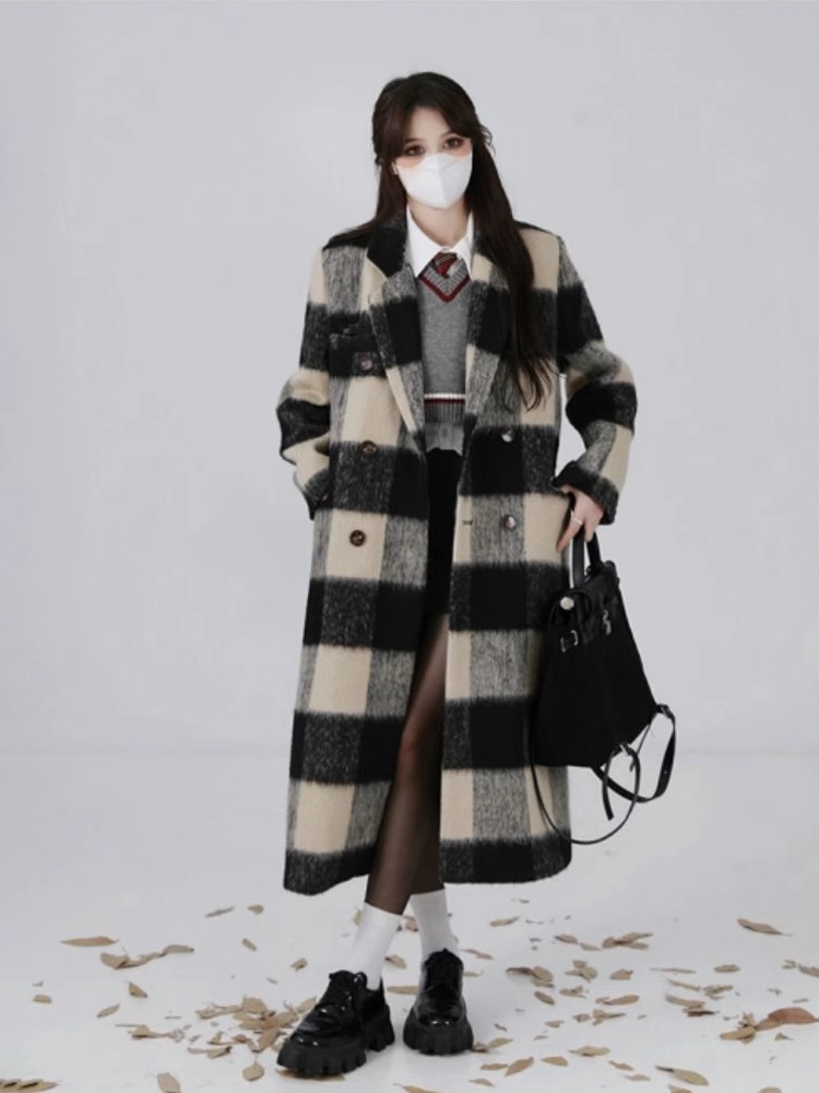 Advanced senses Mao Coats Women Thicken 2023 Autumn winter new black and white plaid in the middle of a long subcoat Herbenwind-Taobao