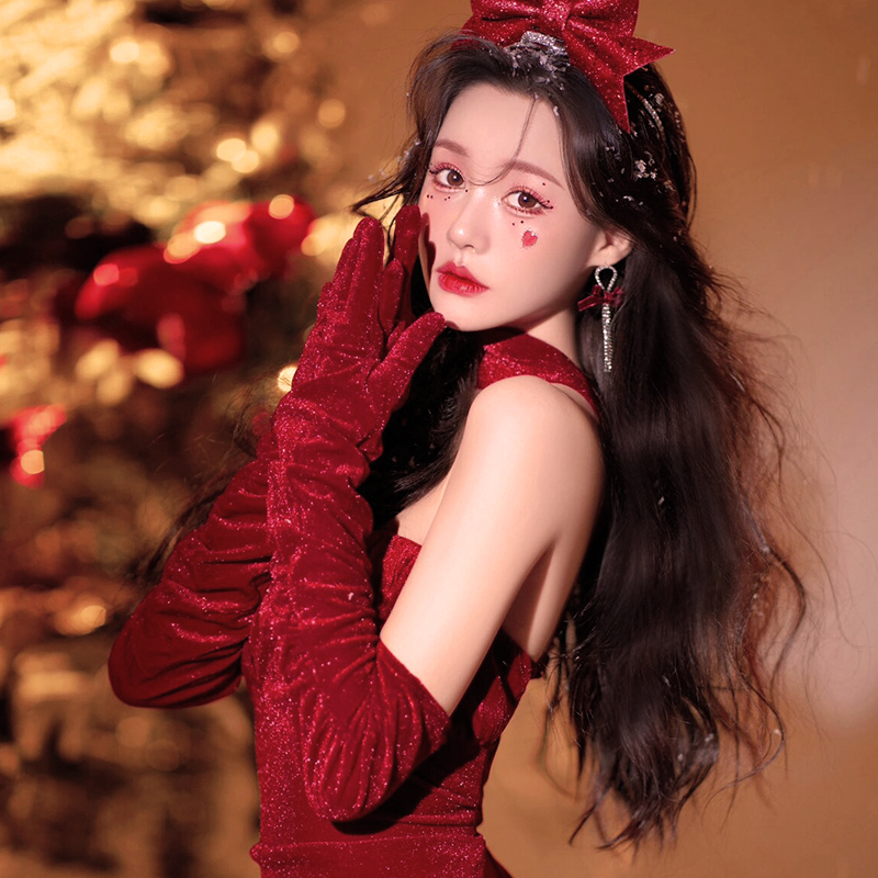Bridal toast with red gloves wedding dress wedding sleeves velvety satin long sleeve sexy black silk gown sleeve woman-Taobao