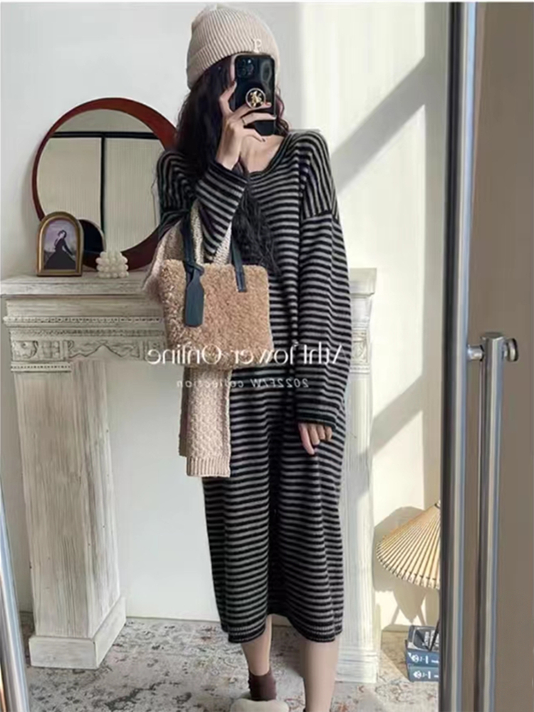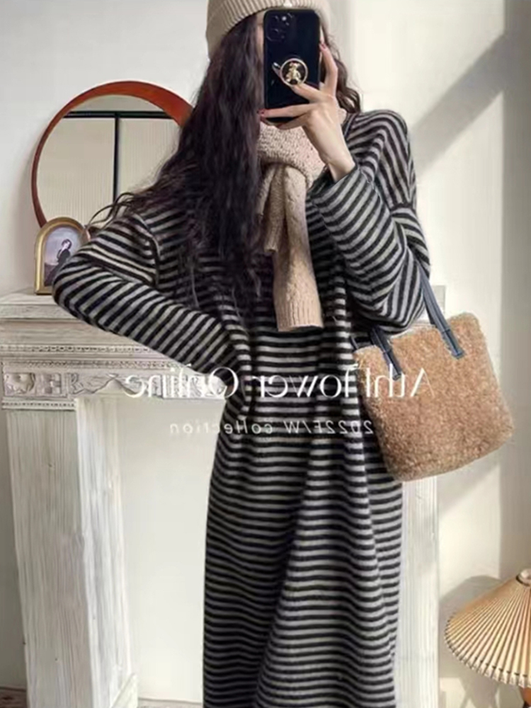 Autumn Winter Ladies Sleep Dress 2023 New Long Sleeves Striped Loose Sleepwear Woman Long style Lazy Wind Home Clothes-Taobao