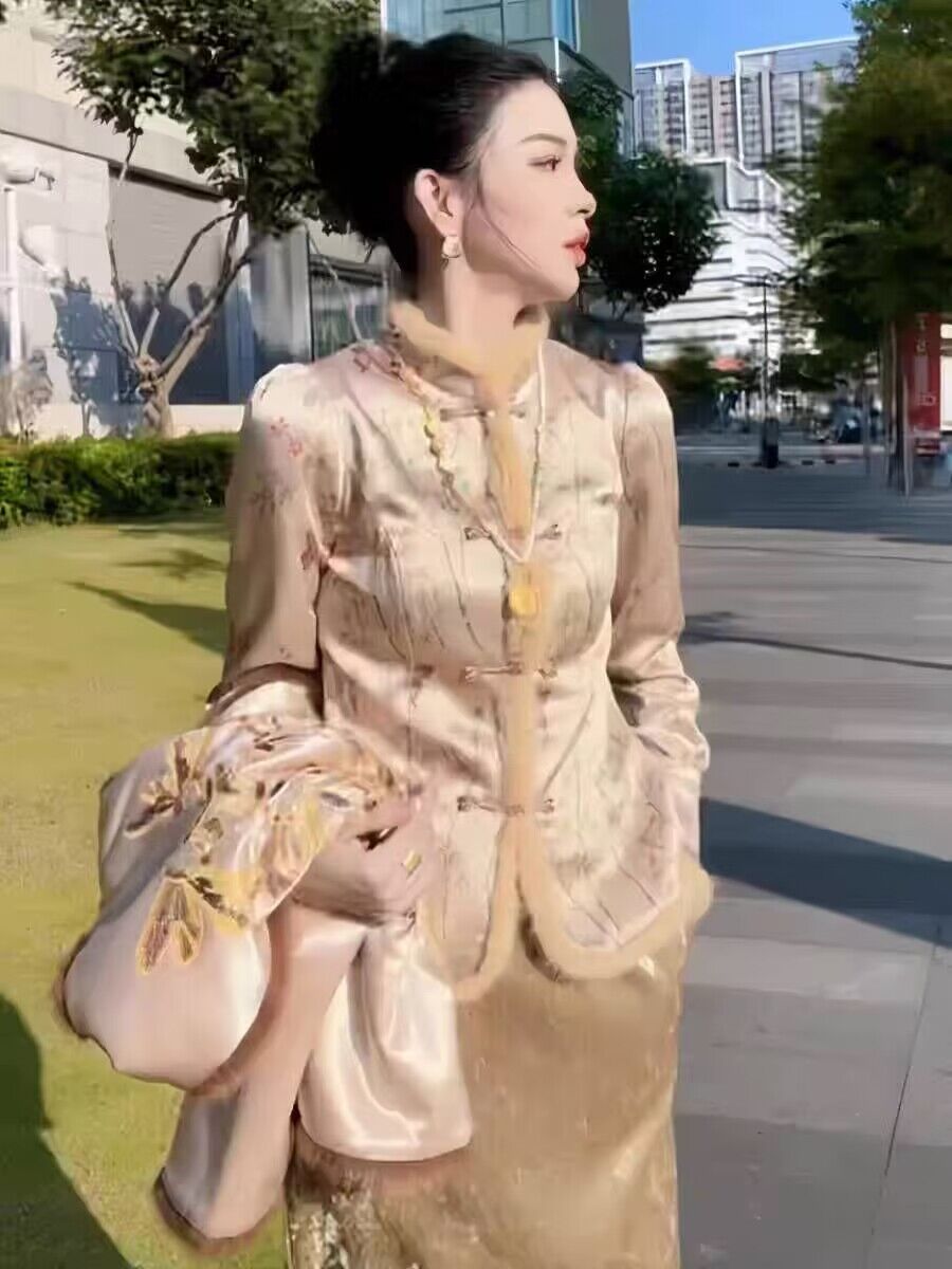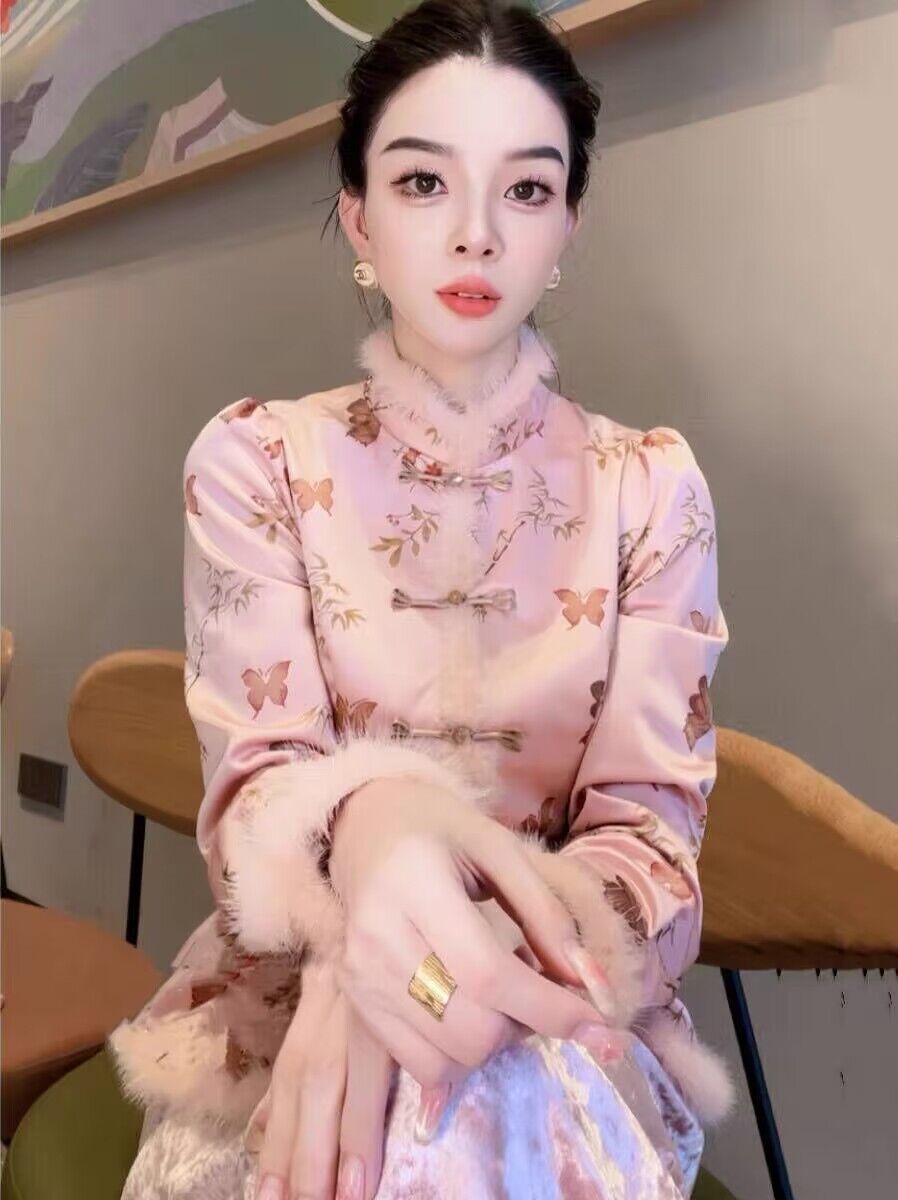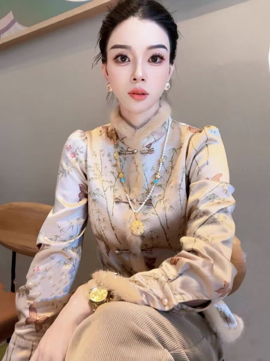 New Chinese style Airy Side Splicing Plus Suede Thickened Tangy Dress Shirt Lady Autumn Winter Qipao Collar Pan Button Inner lap jacket-Taobao