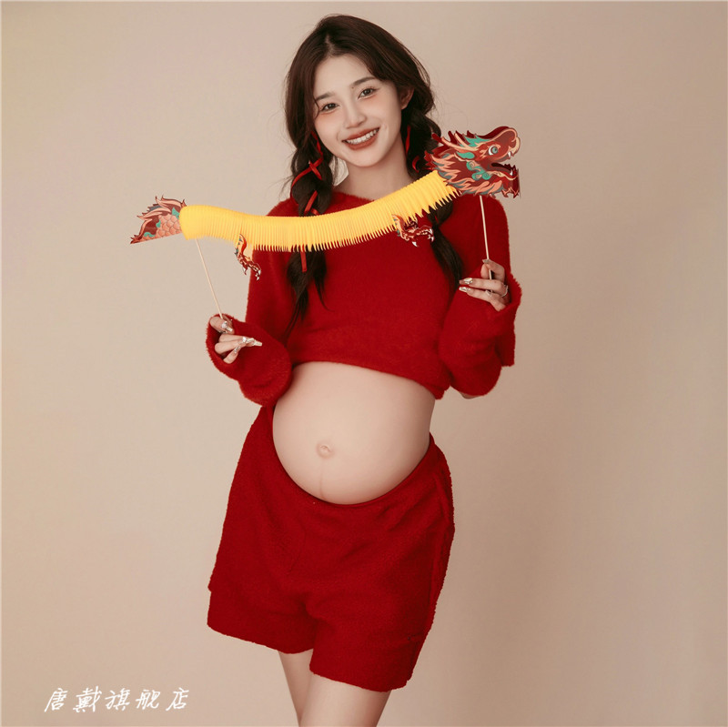 Shadow Building New Pregnant Woman Photos Clothing Dragon Year Themed Red New Year Couples Lazy Sweaty Pregnancy Mommy Art Photos-Taobao