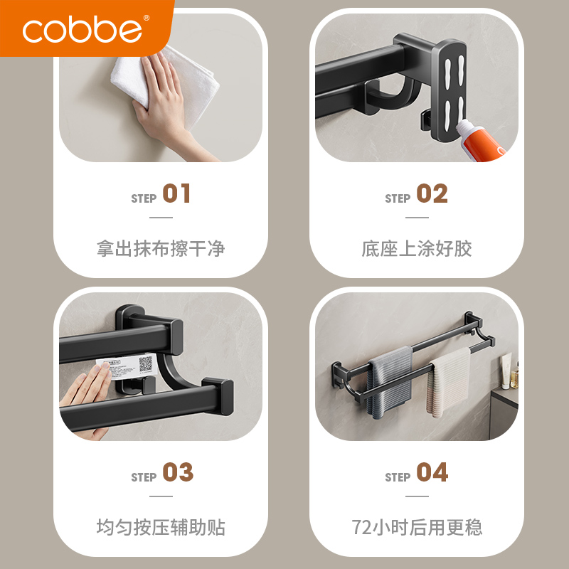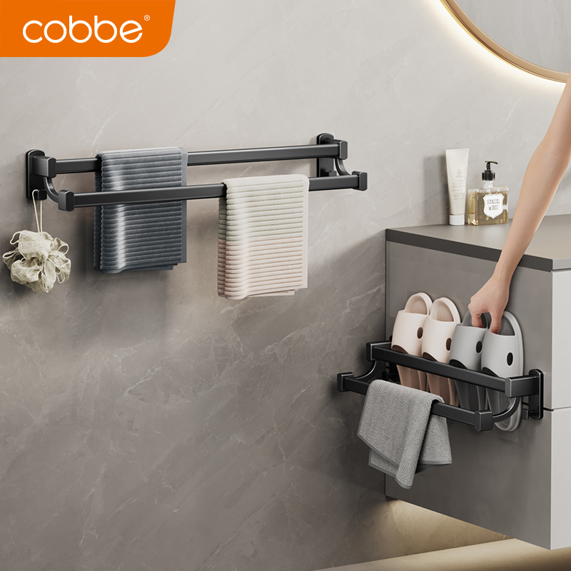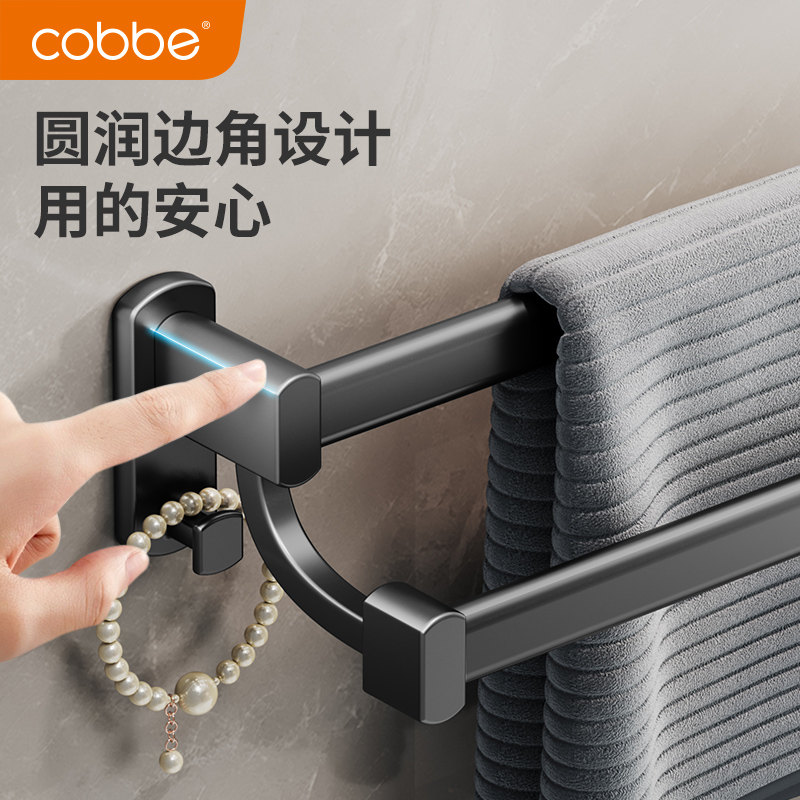 Cabbé Black Towel Rack Double Pole Free Punch Bathroom Toilet Space Aluminum Single Pole Hanging Towel Bath Towel Rack-Taobao