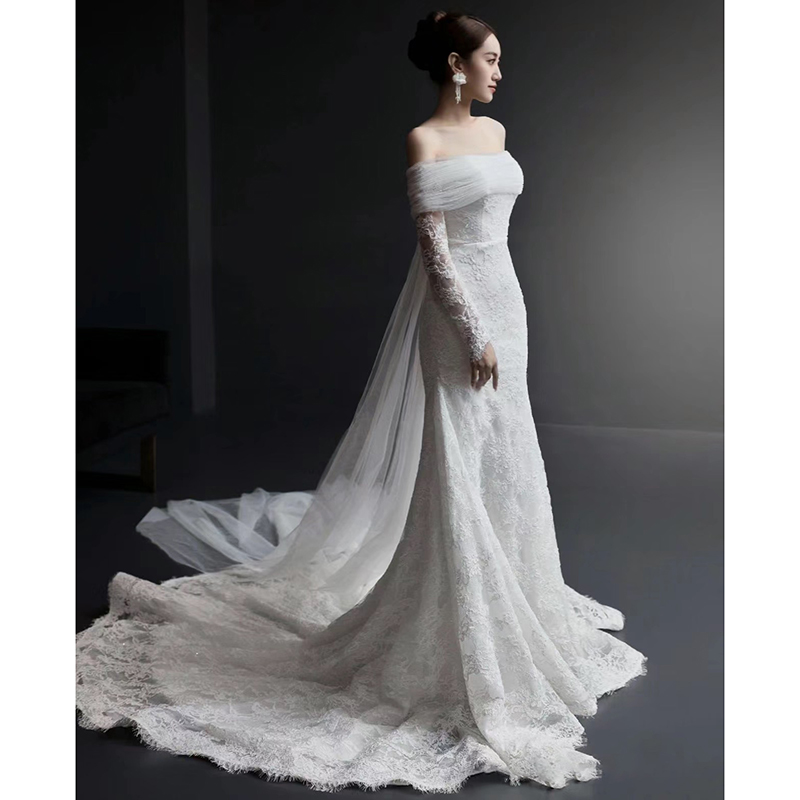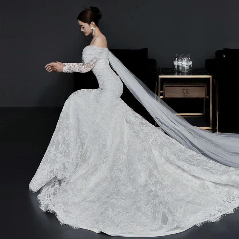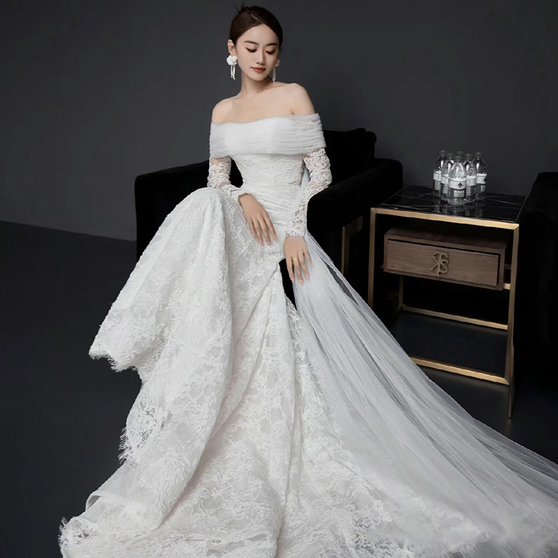 Straight Shoulder Light Wedding Dress Lace Light Lavish Temperament Bride Married Out of the house Feminine Body Tail Long Sleeve Gown Slim Fit-Taobao
