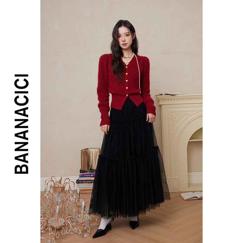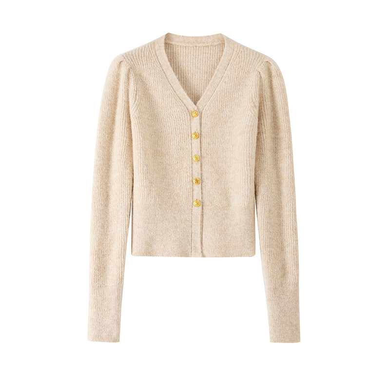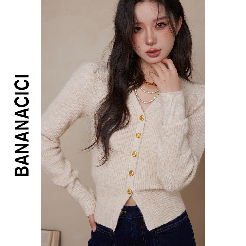 BANANA CICI2023 years Winter new retro V Collar Bubble Sleeves Positive Shoulder Sweater Women's Delicate Knit Cardiovert-Taobao