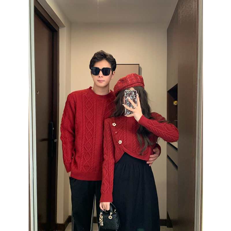 Lovers' clothing autumn and winter new overfire New Chinese New Year red sweater dress with dress One man and woman Korean version French style needle weaver-Taobao