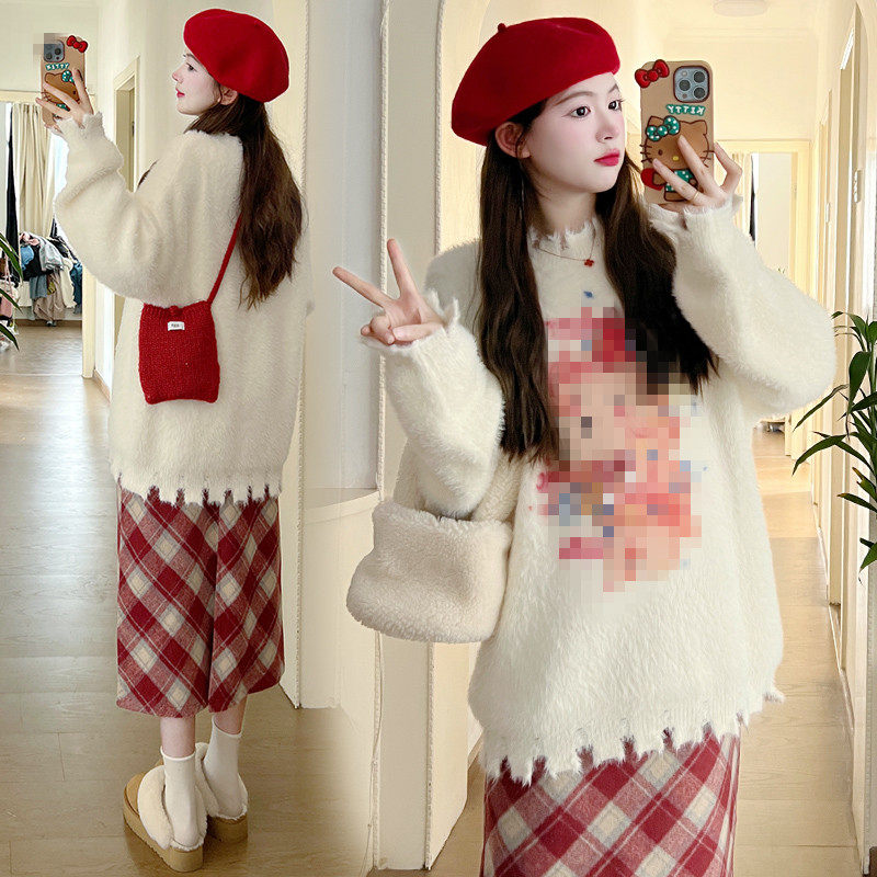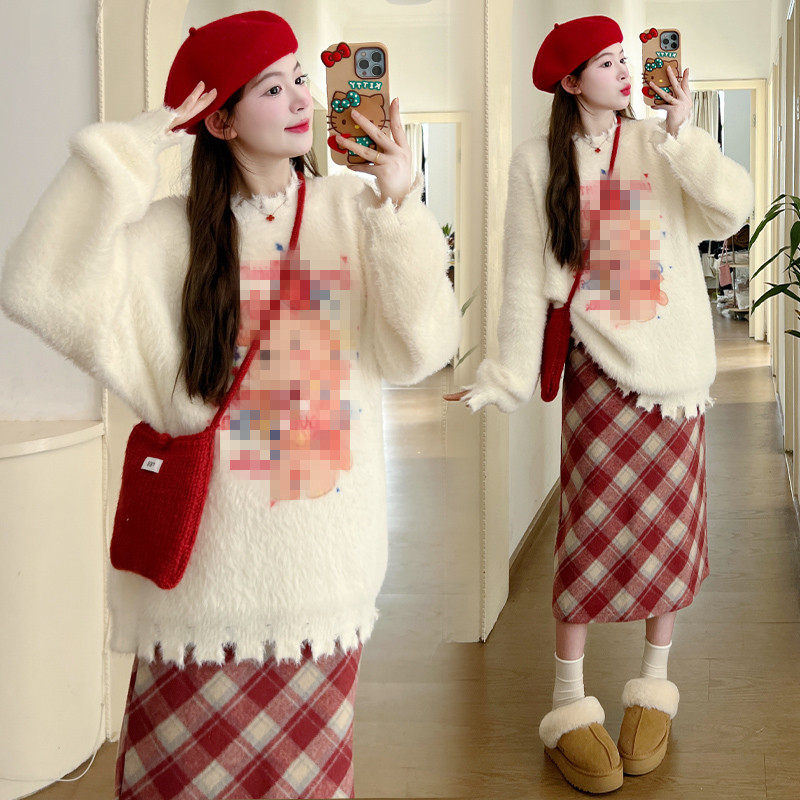Pregnant woman autumn and winter suit foreign air trendy Han version easy to thicken the bell Christmas sweater with a half body dress Two sets-Taobao