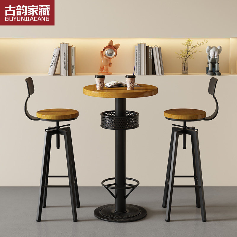 Solid Wood Bar Table High Foot Round Table Commercial Milk Tea Shop Coffee Shop Small Bar Bulk Terrace Bar High Foot Table And Chairs-Taobao