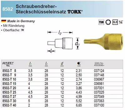 Germany HAZET Star Socket Head Screwdriver TORX 8502-T20 8502-T25 8502-T30