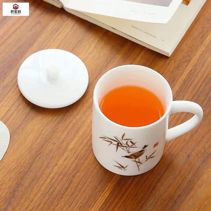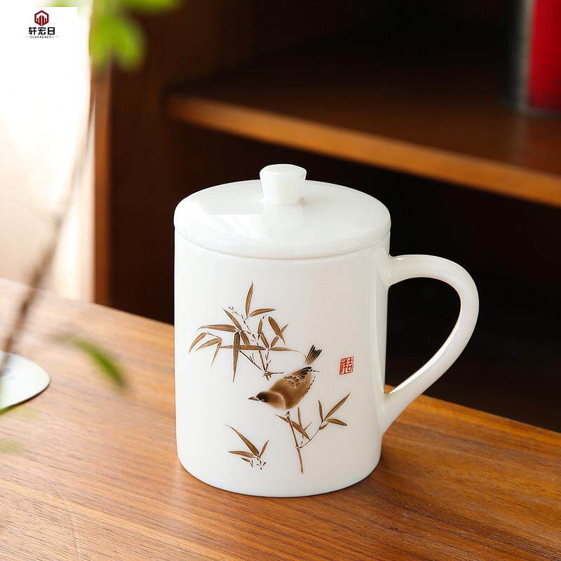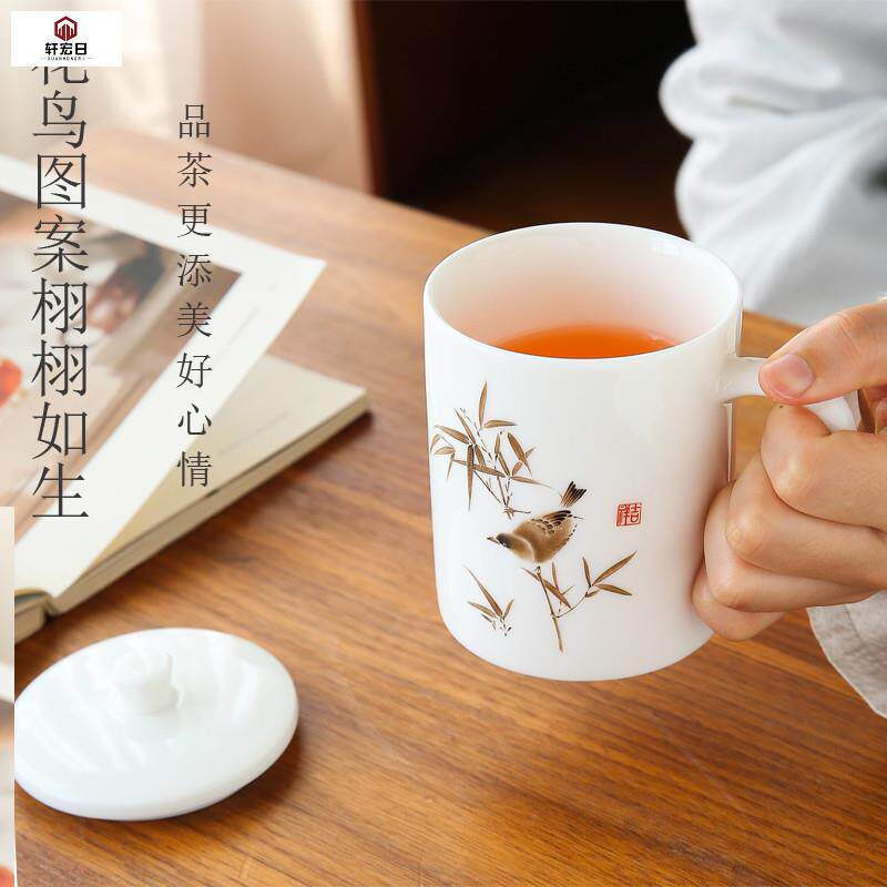 380ml flower bird pattern with Gaddefied white porcelain office cup goat fat jade porcelain large capacity office personal water glass-Taobao