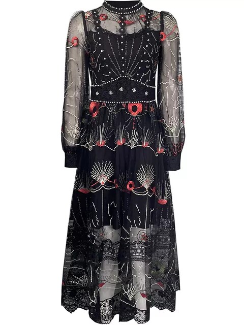 2024 Spring new retro collection waist display slim and heavy work lace mesh yarn embroidery long sleeve dinner annual meeting gown dress dress-Taobao