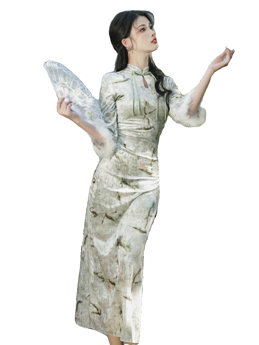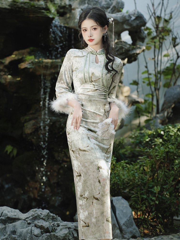 New Chinese retro-ancient Republic of China Wind young and beautiful autumn and winter with velvet thickened qipao shawl with two sets of one-piece dress-Taobao