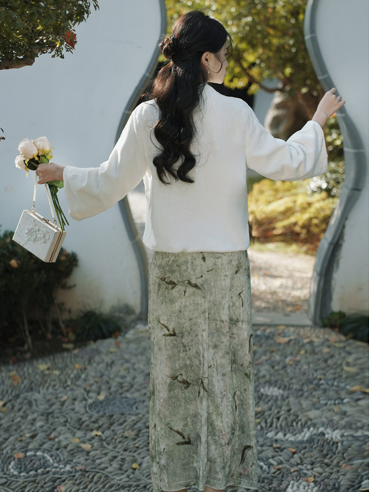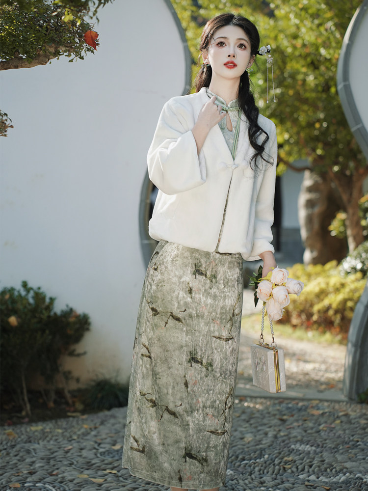 Single white shawl single plus suede qipao garnter with velvety cheongsam shawl.