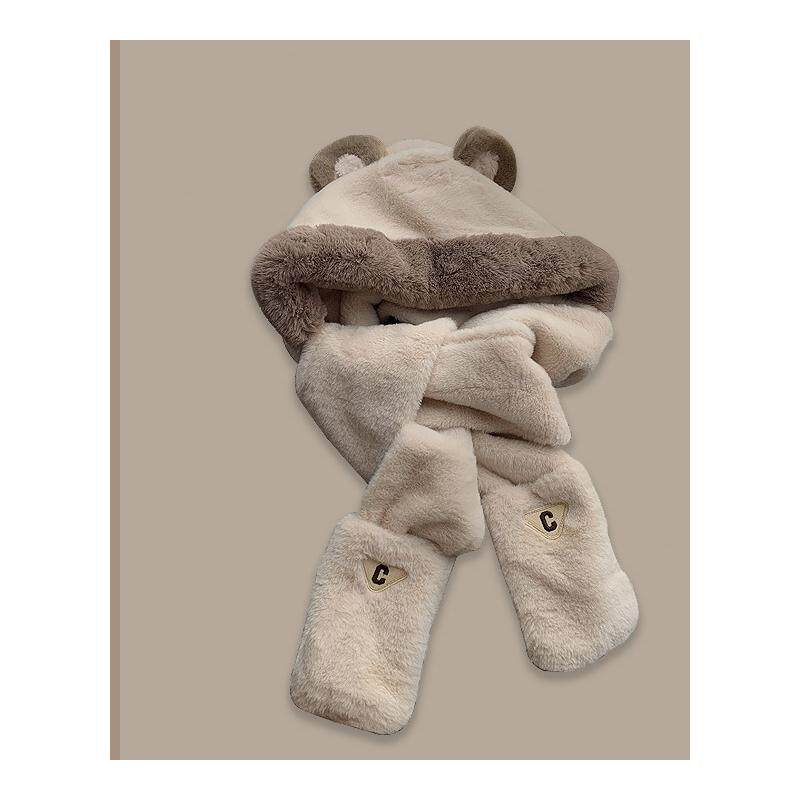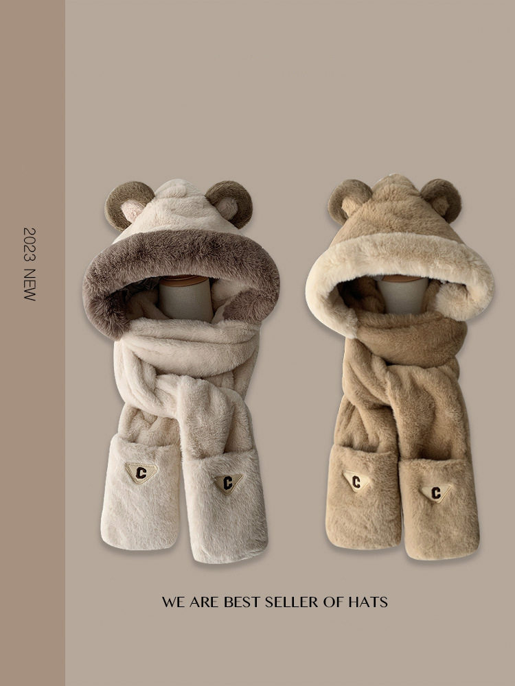 2023 furry small bear ears hat scarf scarves gloves female winter warm ear hat anti-chill bike Lei Feng cap-Taobao