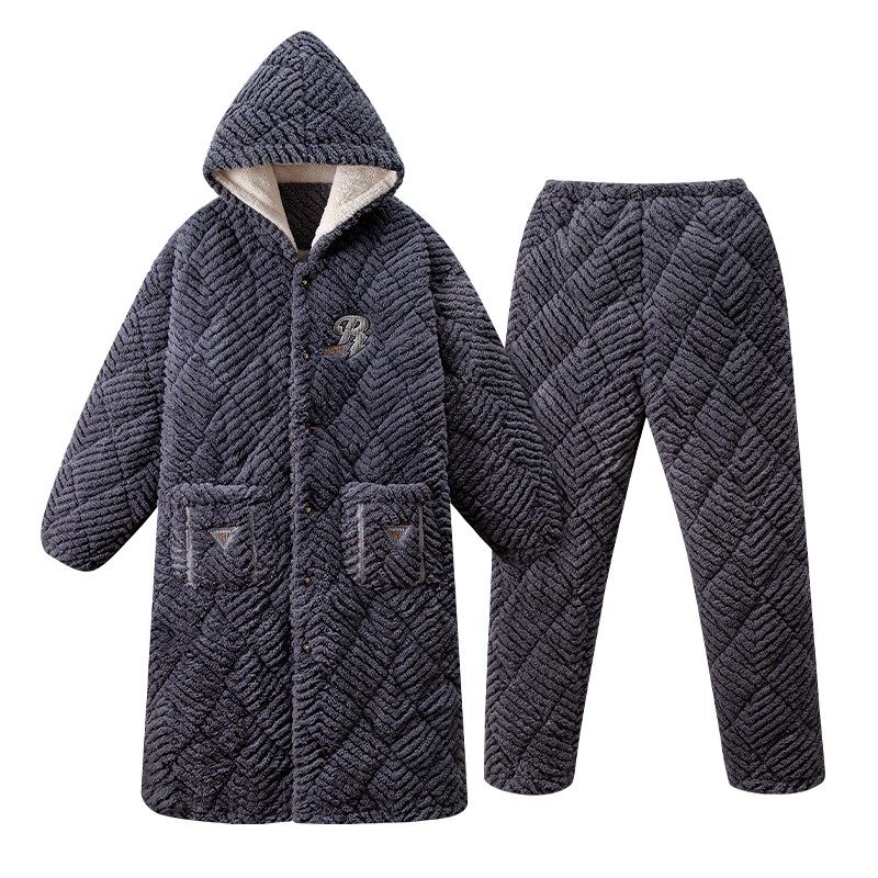 Mid-length style sleeping robe for men's autumn and winter coral suede clip cotton triple layer pyjamas thickened suede suit flannel flannel-Taobao