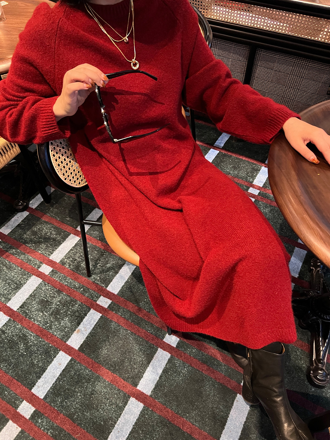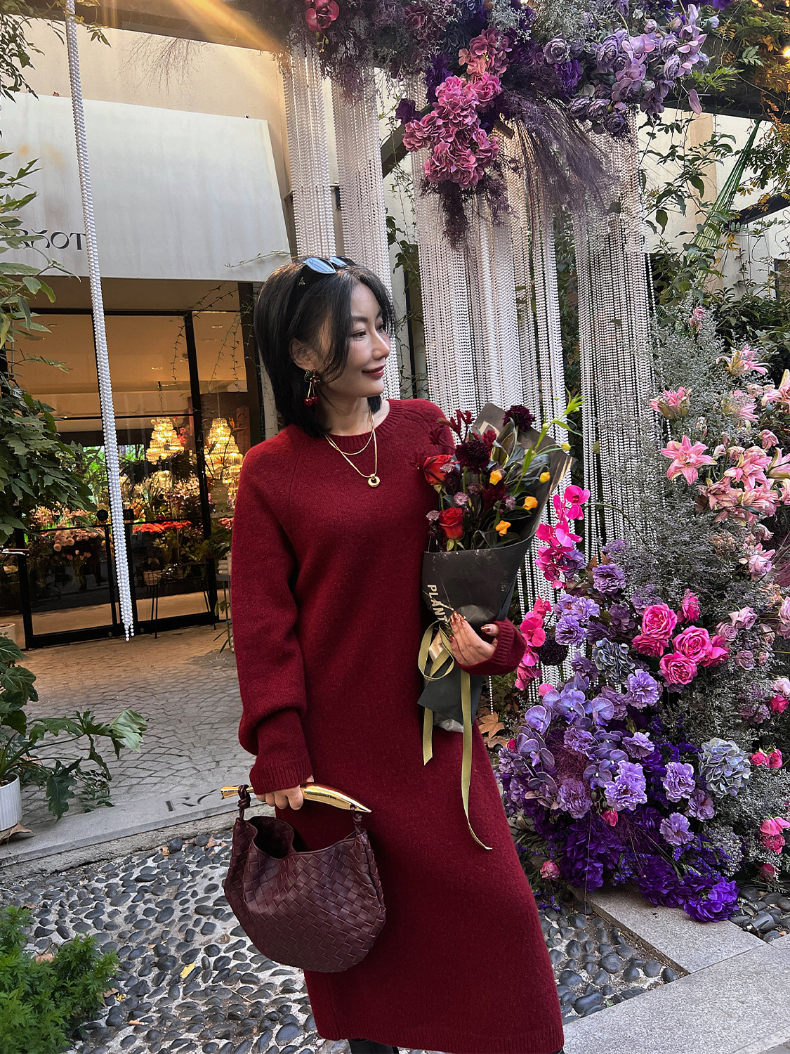 VIANIE Christmas New Year ambience with red real silk cashmere suede 100 lap long sleeves loose knit dress-Taobao