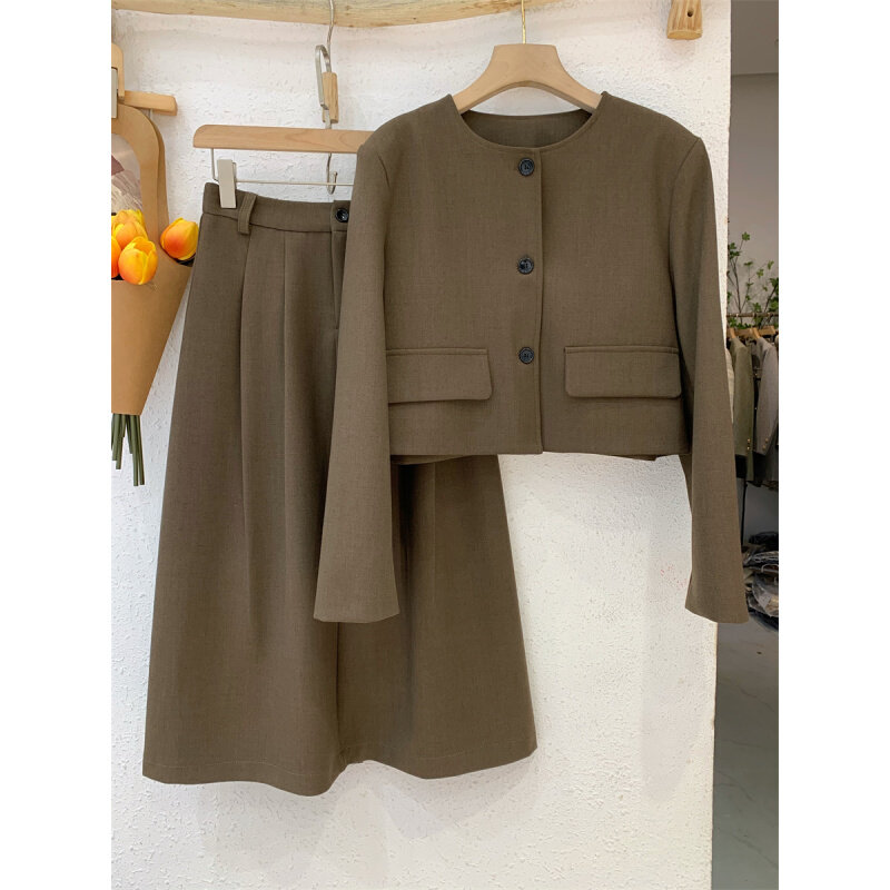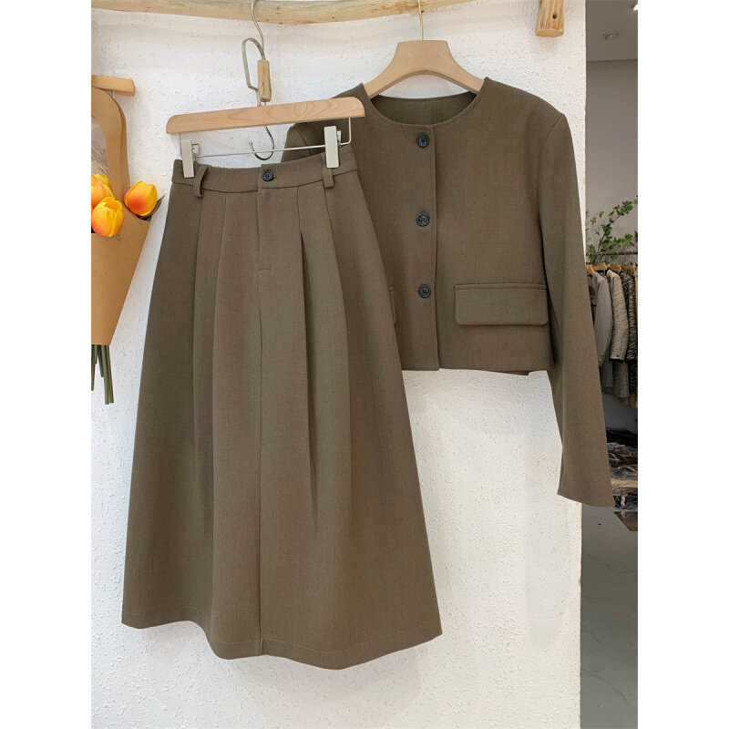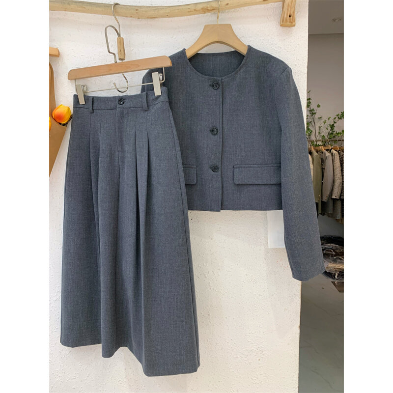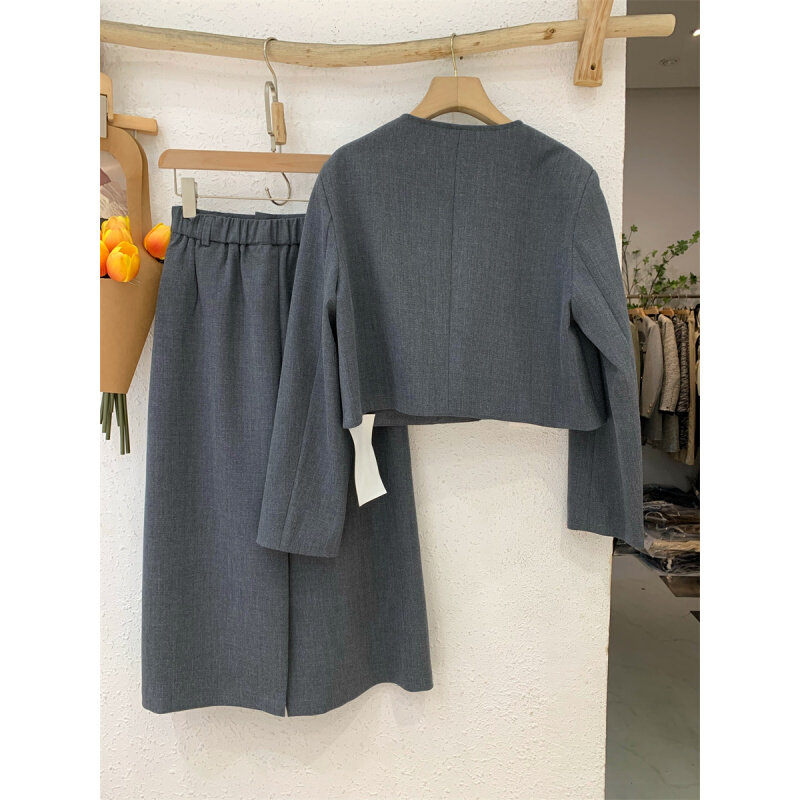 French Grey Round Collar Suit Half Body Skirt Suit Woman Mid 2023 Fall High waist Fashion temperament Two sets-Taobao