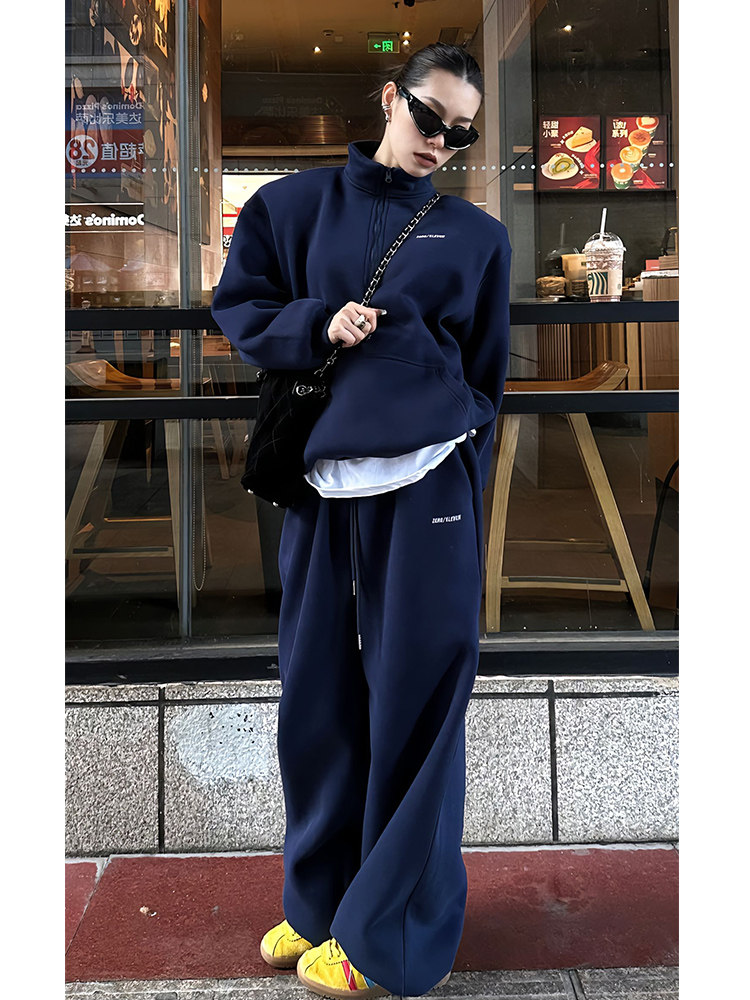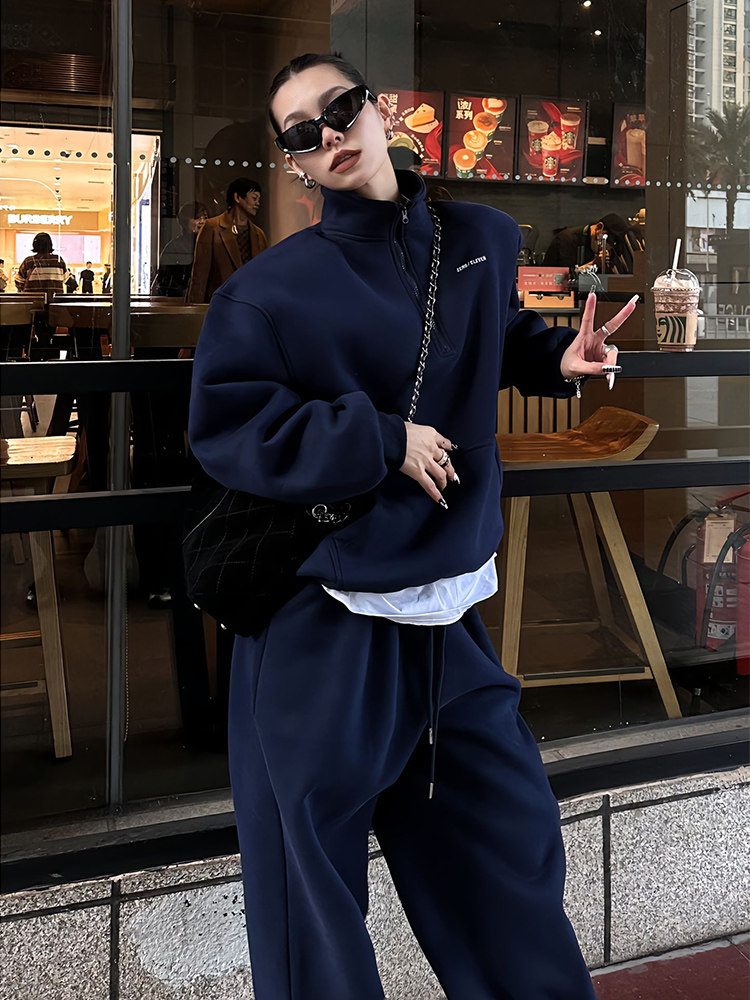 Stock plus velvet Collar Clothing Suit Women Autumn Winter Advanced Senses Fried Street Fashion Casual Sportswear two sets of foreign air-Taobao