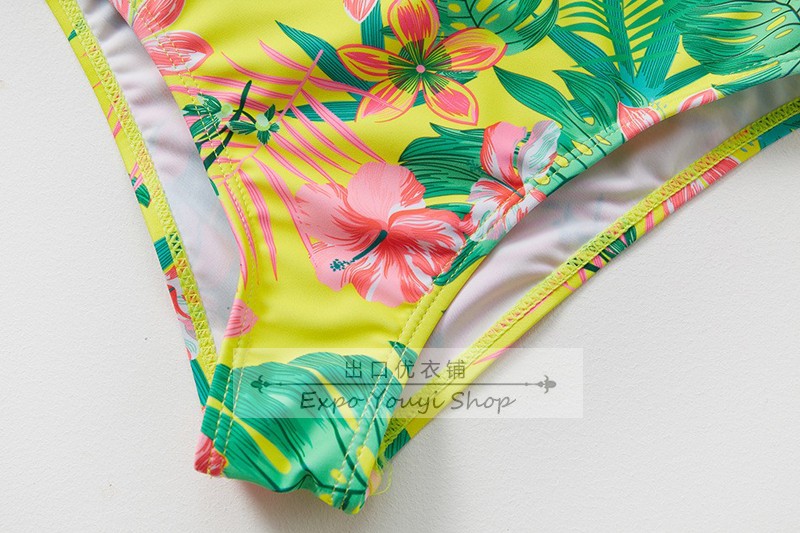 (Conspicuous bright yellow) 5-14-year-old girls' split hot spring swimsuit with flying sleeves and tooth-edge color-printed flower pants