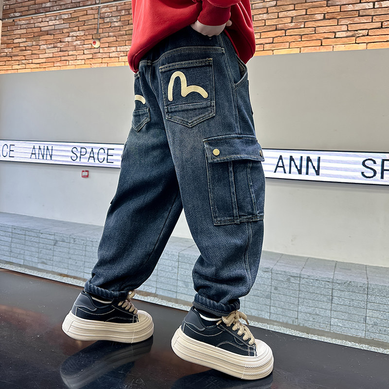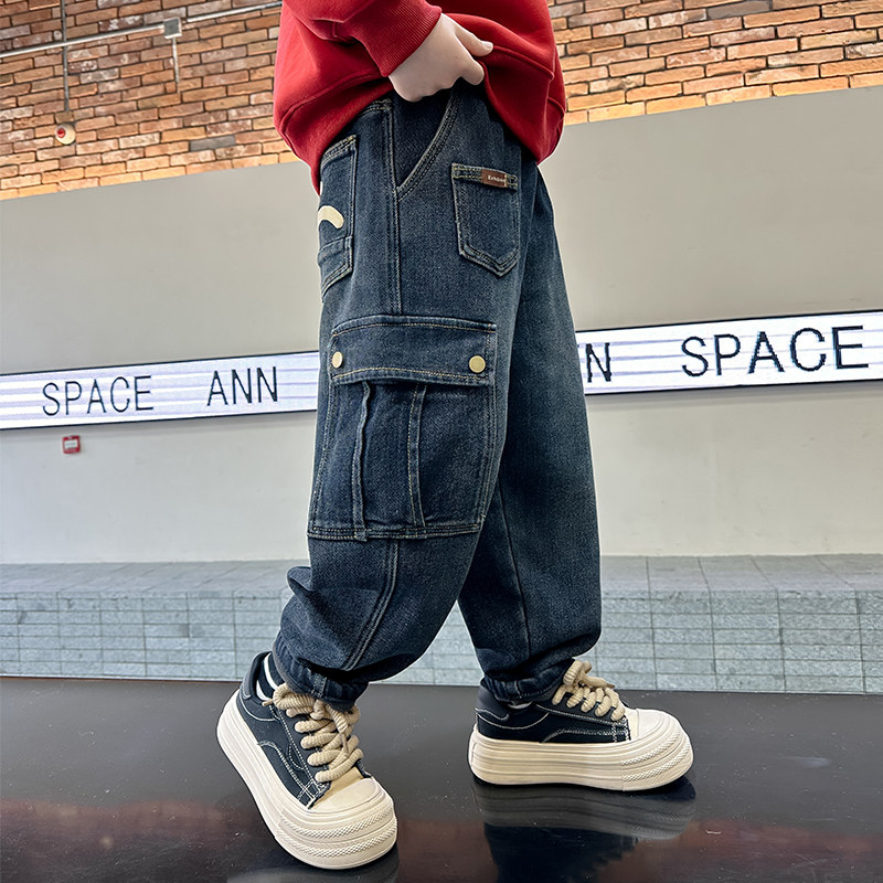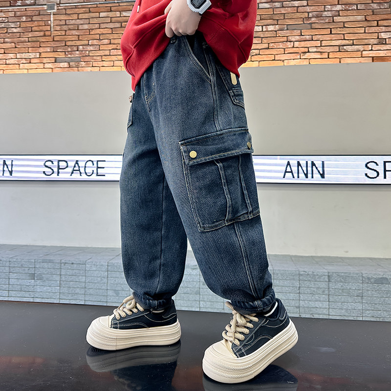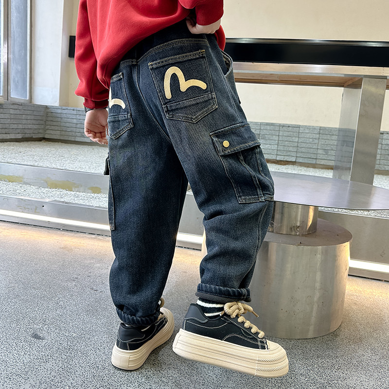 Boy gush pants autumn winter style 2023 new children Thickened Denim Work Pants Big Boy Winter Dress Warm-Taobao