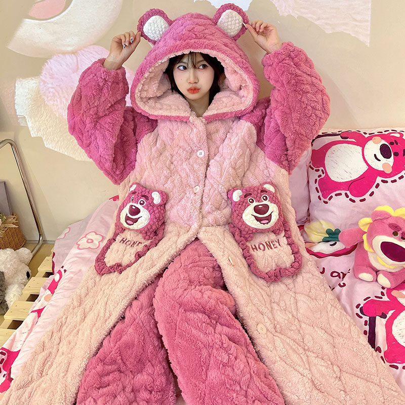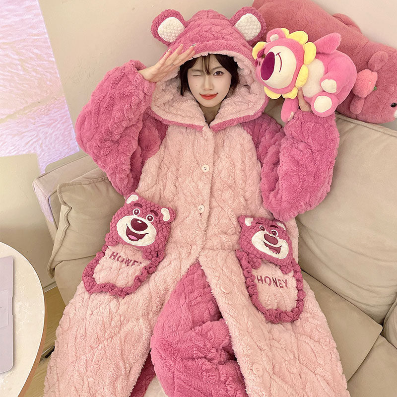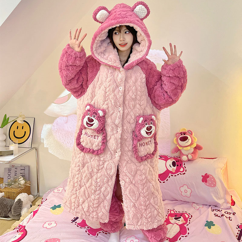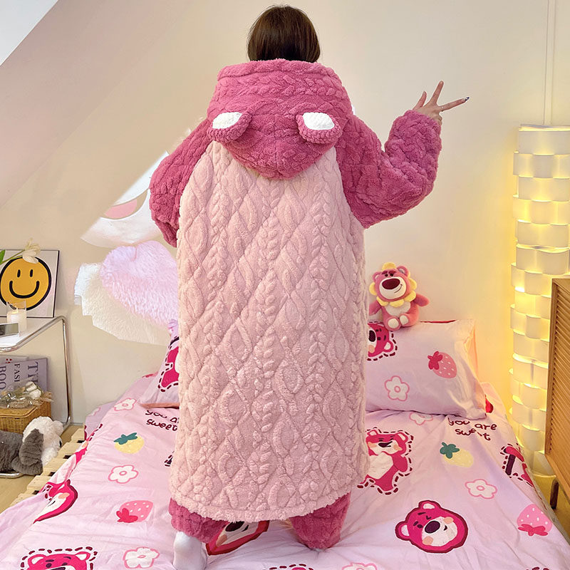 Sleeping robe woman Winter day Three layers clip cotton 2023 new coral suede pyjamas long style thickened with velvety and cute family conserved-Taobao