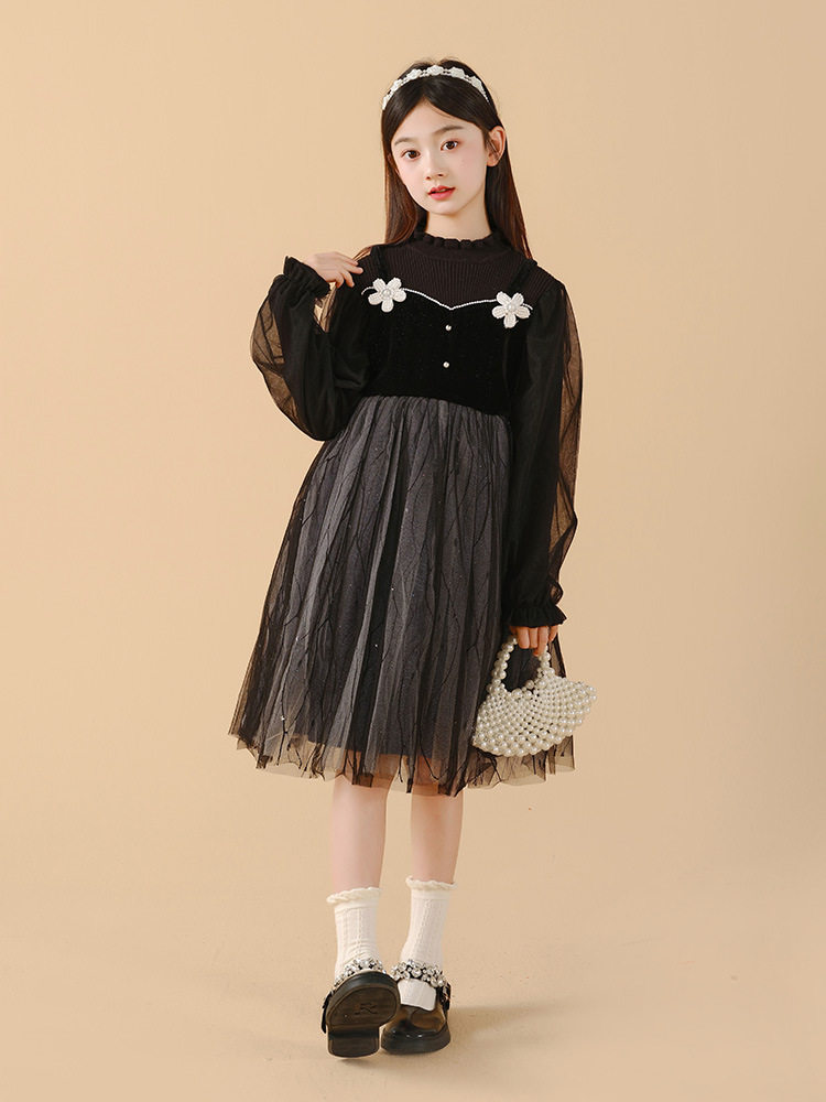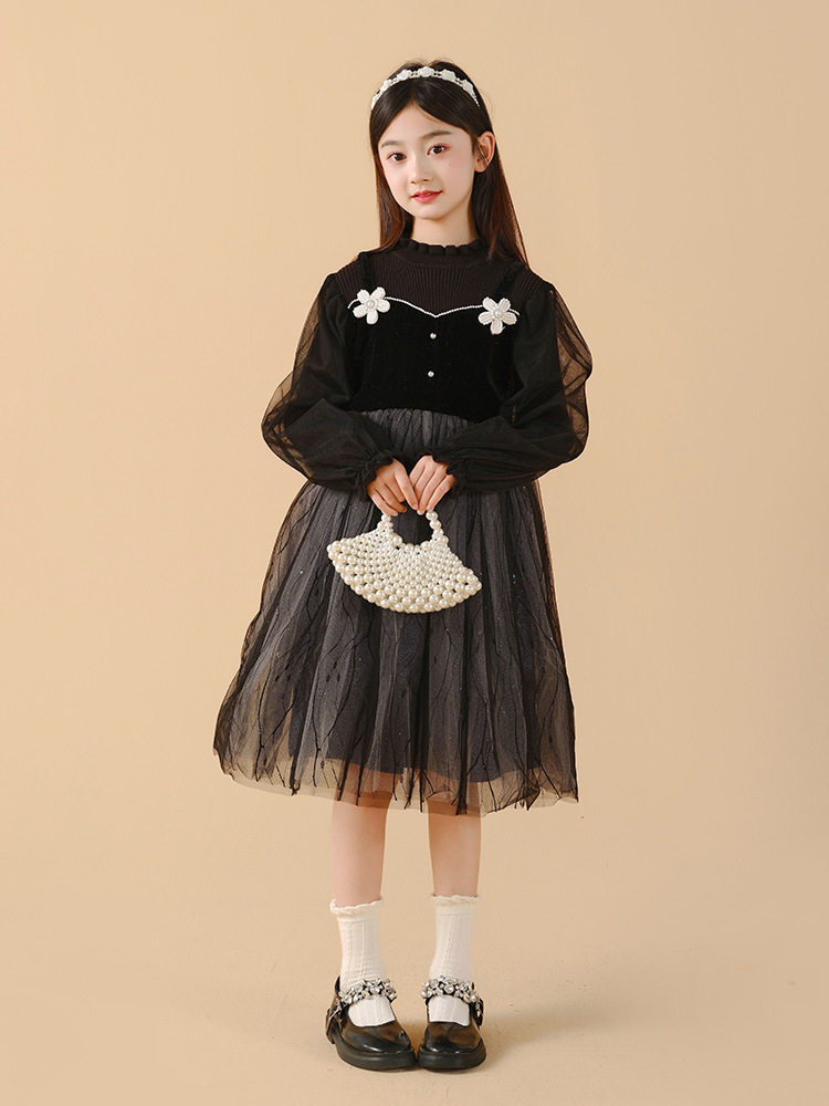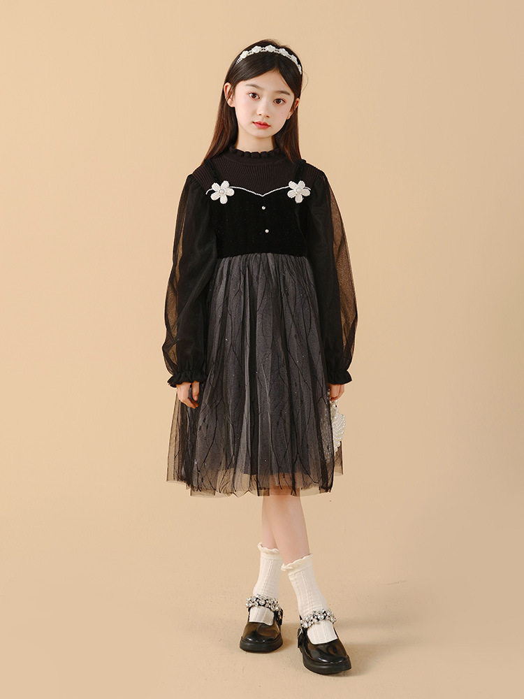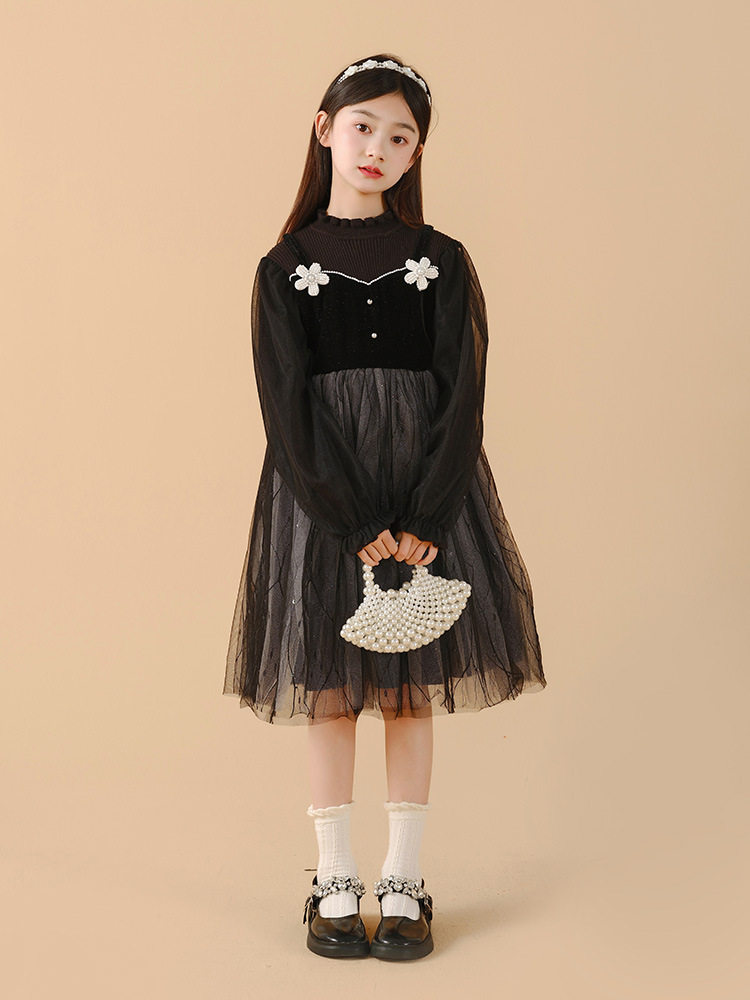 Girl's dress 2023 autumn winter new CUHK Tong Long sleeves black mesh yarn splicing Xiaoxiang girl Princess skirt-Taobao