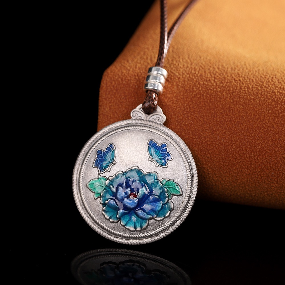 National Wind Burning Blue s999 Foot Silver Peony Necklace Woman's Airy Coat Chain Retro made of old ethnic wind Yuanyang pure silver-Taobao