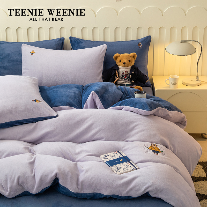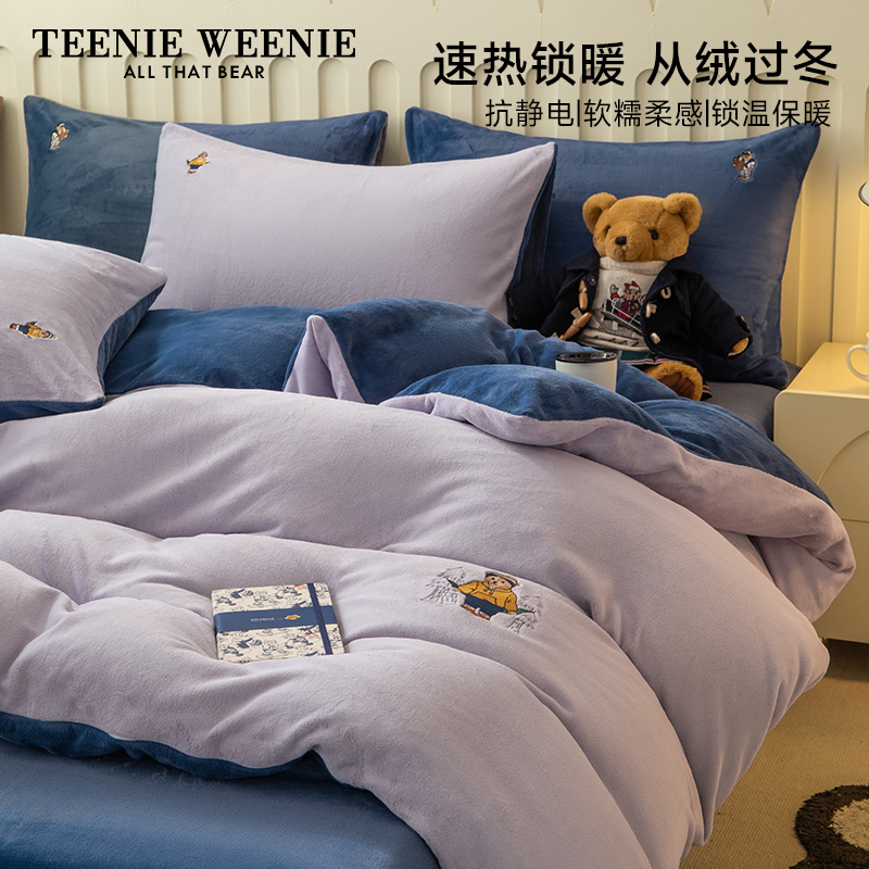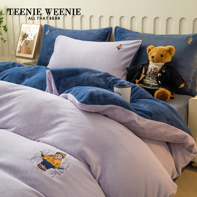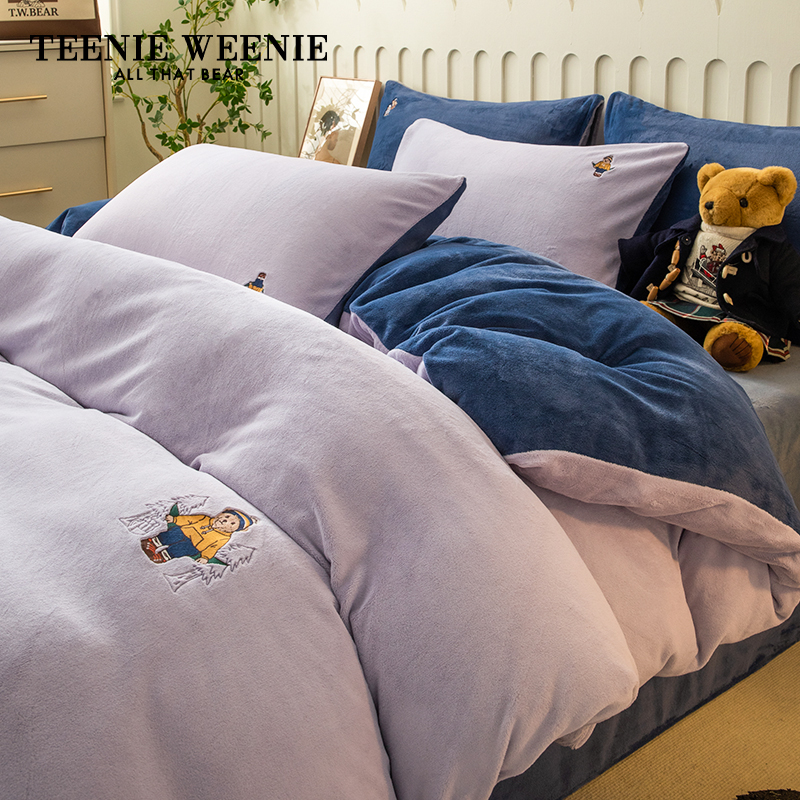 TeenieWeenie Small Bear Embroidery Milk Suede Four Pieces Of Coral Suede Double Face Gushed Quilt Cover Bed Linen Winter-Taobao