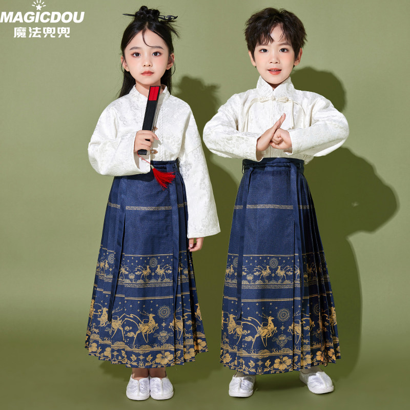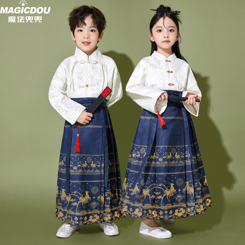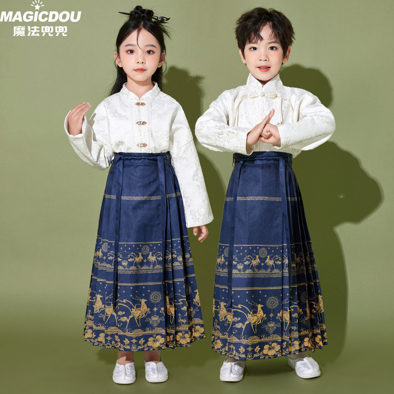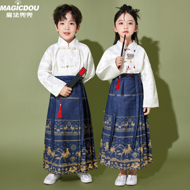H2019 woman in white jacquard blouse H2029 blue small deer horse face dress H2019 woman in white jacquard blouse H2029 blue small deer horse face skirt red black fan H2