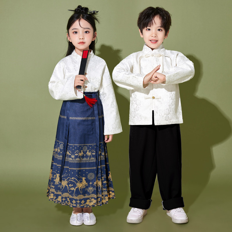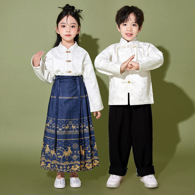 H2019 woman in white jacquard blouse H2029 blue small deer horse face dress H2019 woman in white jacquard blouse H2029 blue small deer horse face skirt red black fan H2