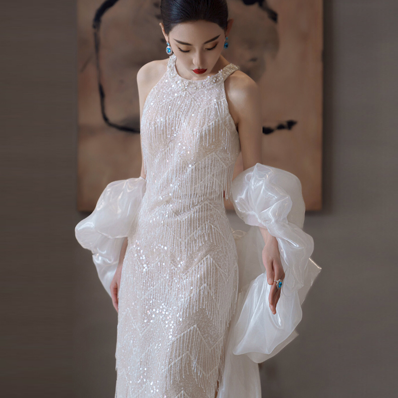 Sequin Reworked Light Wedding Dress Bridal Style High-end Fish Tailoring Body Dress Temperament Light Lavish Hanging neck Nightgown Gown-Taobao